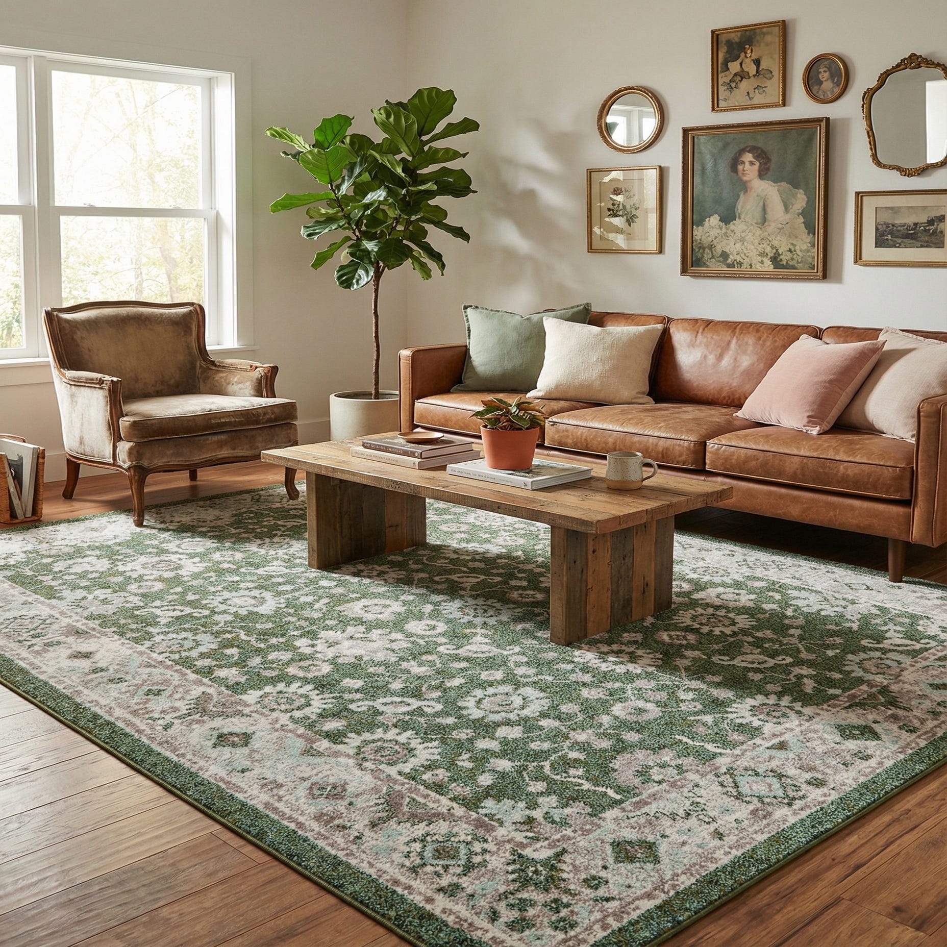 Primary color is Green. Colors in this rug include: Green, Beige, Ivory, Light Blue.