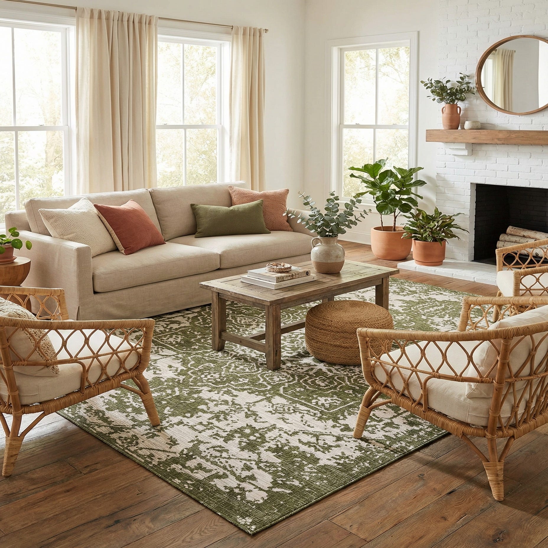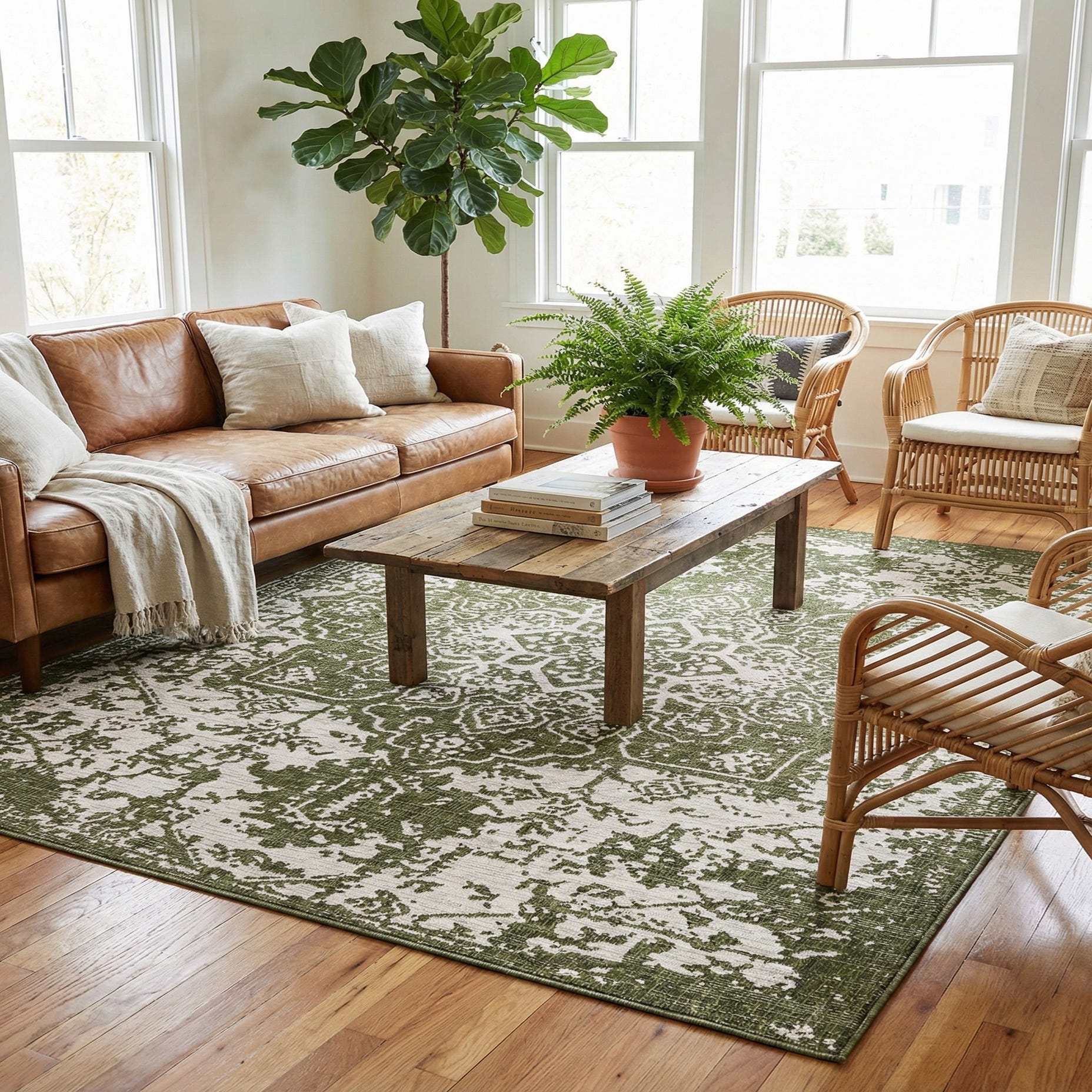 Primary color is Green. Colors in this rug include: Green, Ivory.