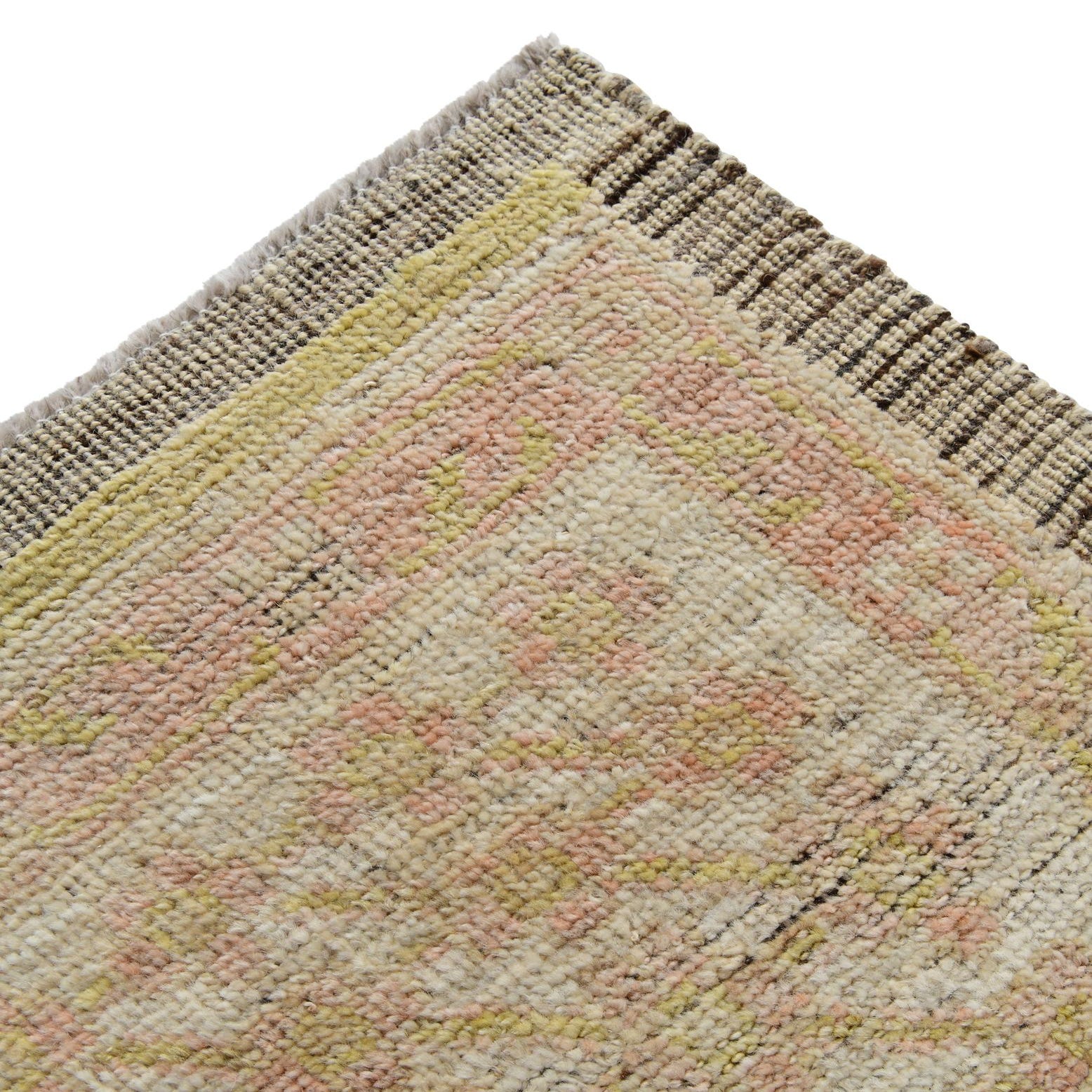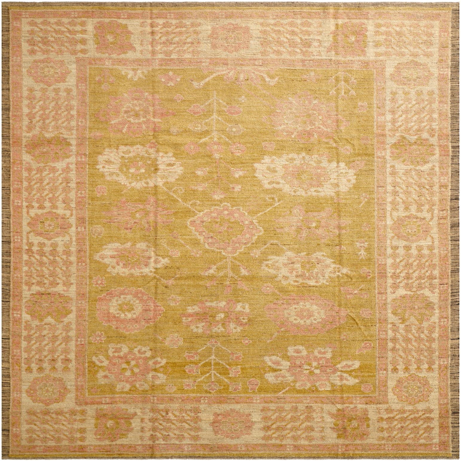 Primary color is Green. Colors in this rug include: Green, Ivory, Pink, Brown.