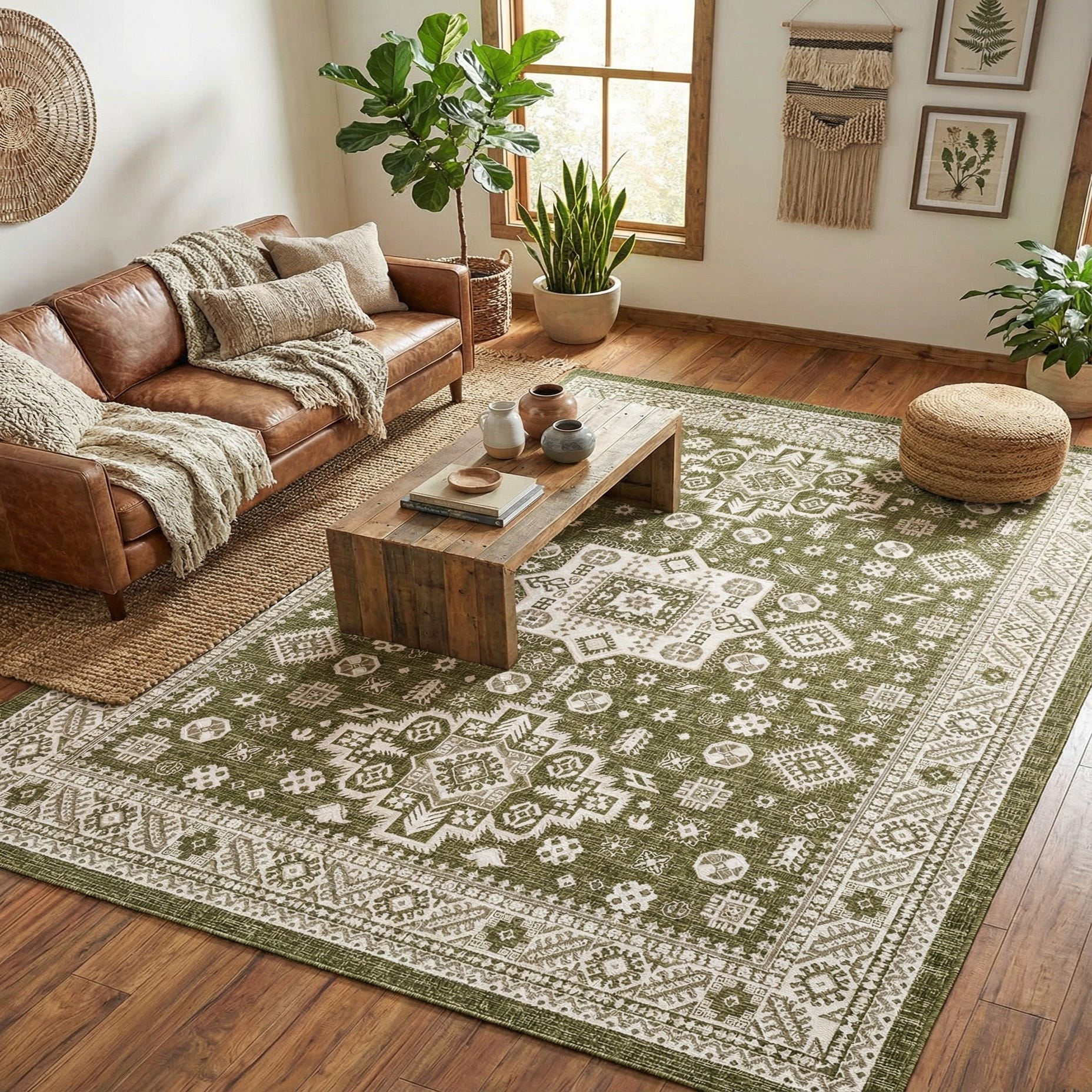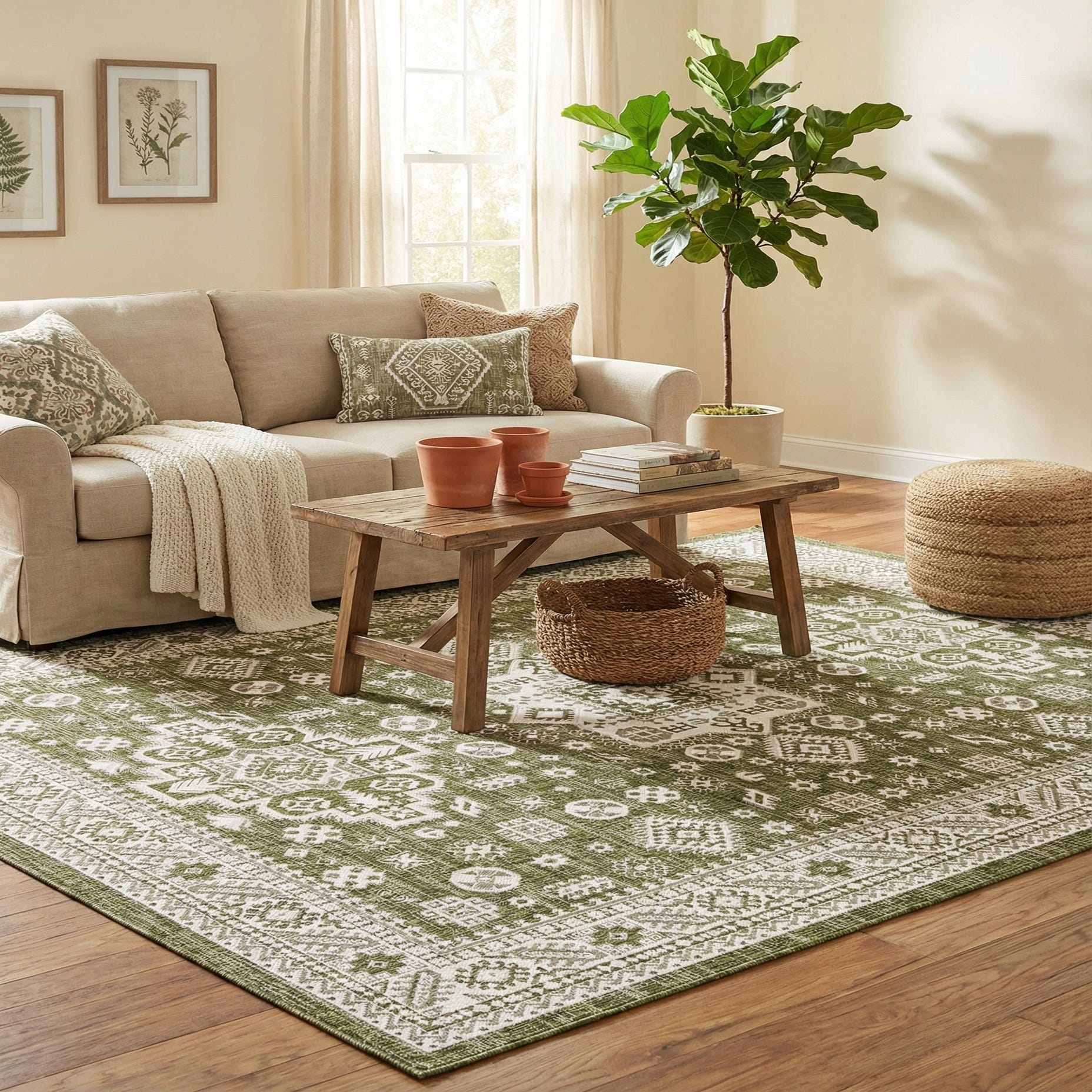 Primary color is Green. Colors in this rug include: Green, Ivory.