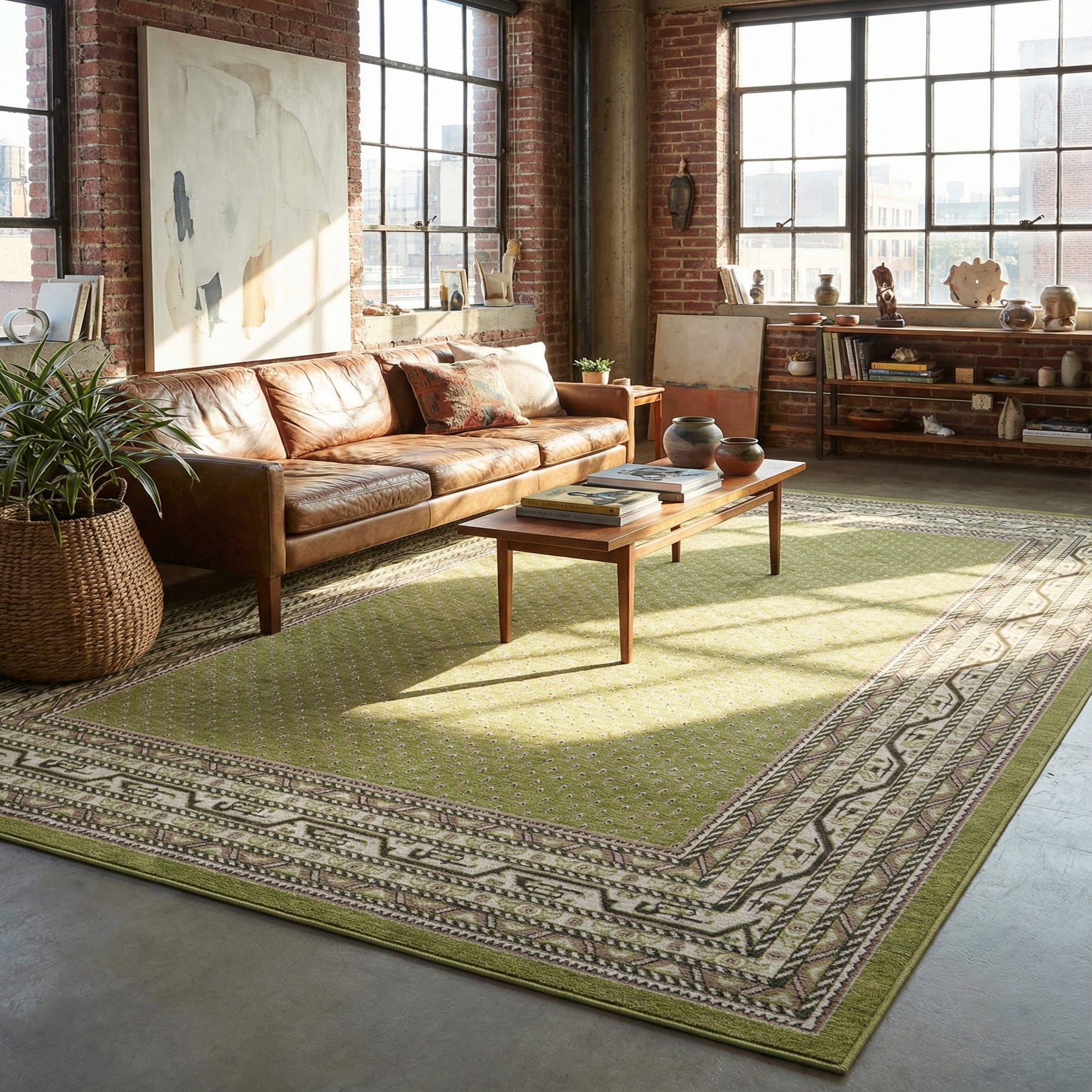Primary color is Green. Colors in this rug include: Green, Gray, Ivory.