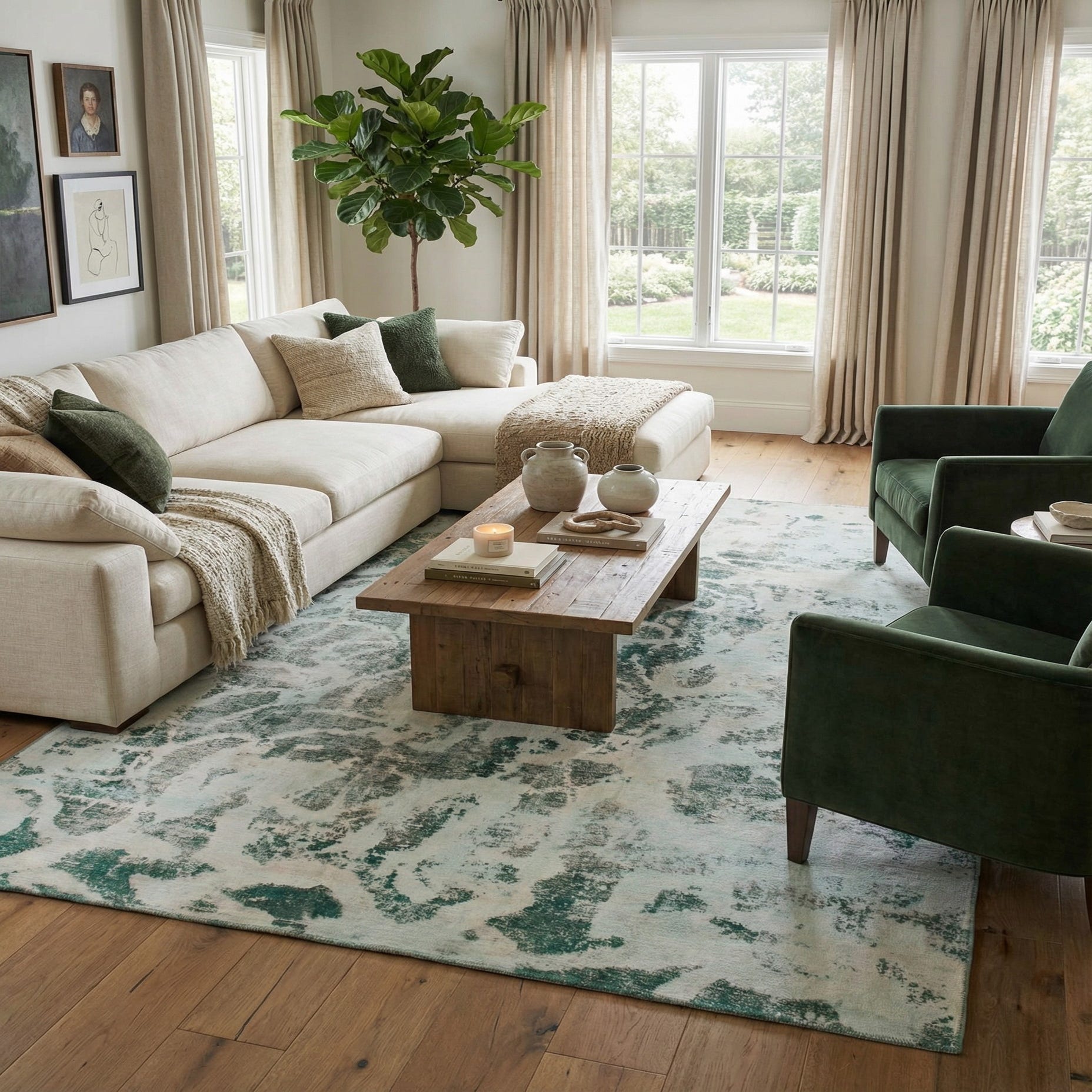 Primary color is Green. Colors in this rug include: Green, Light Green, Puce.