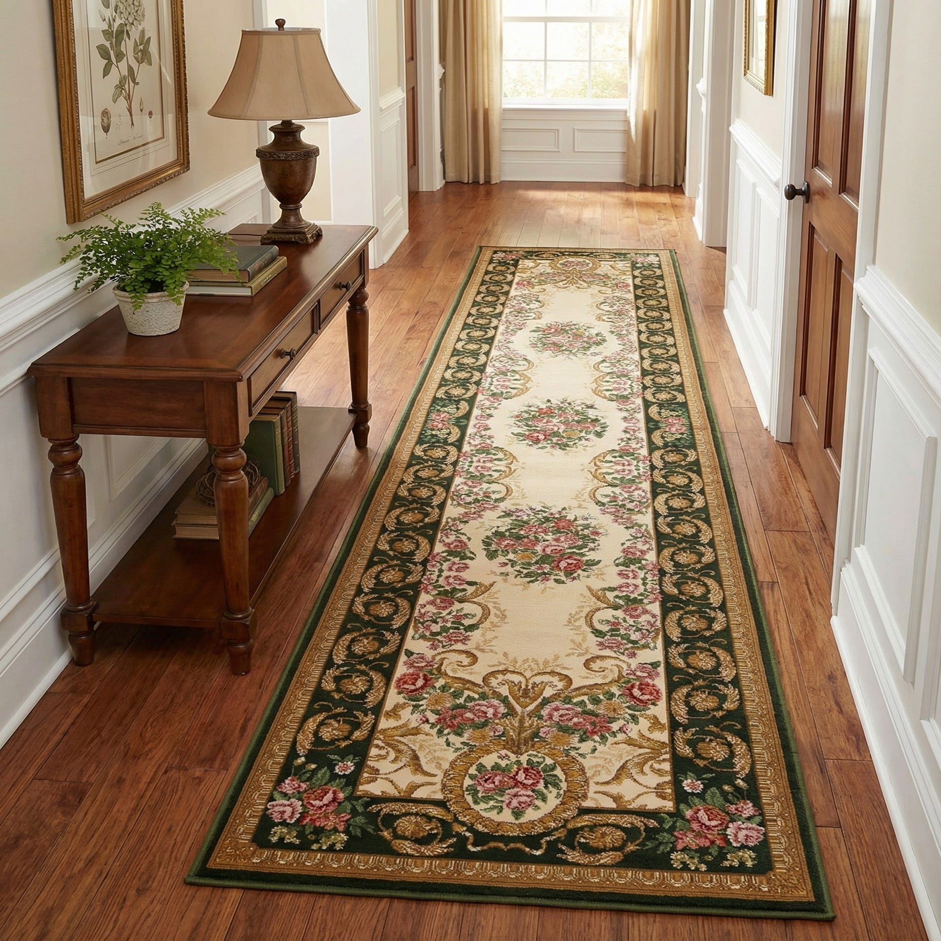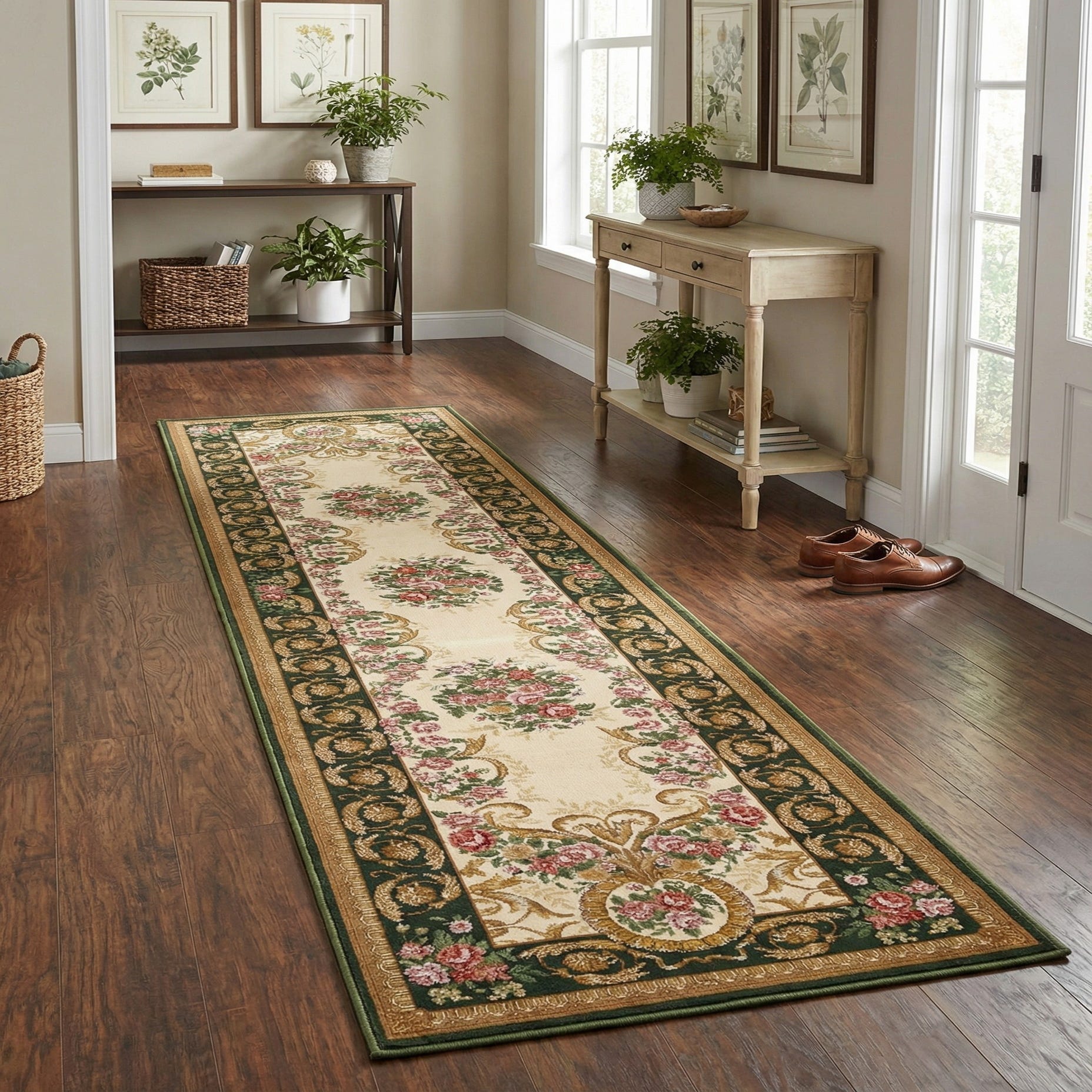 Primary color is Green and Ivory. Colors in this rug include: Green and Ivory, Gold, Ivory, Pink, Red.