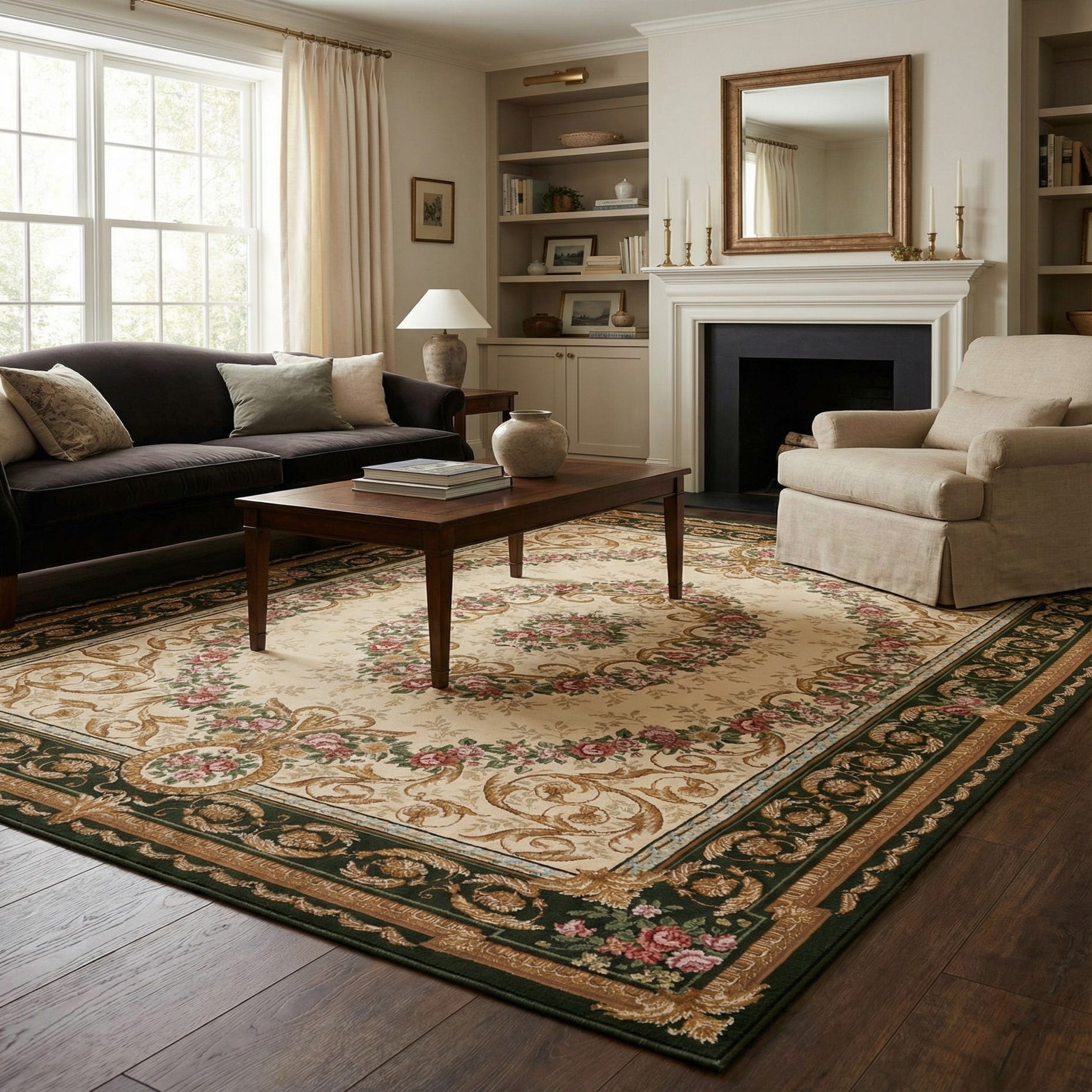 Primary color is Green and Ivory. Colors in this rug include: Green and Ivory, Gold, Ivory, Pink, Red, Light Blue.