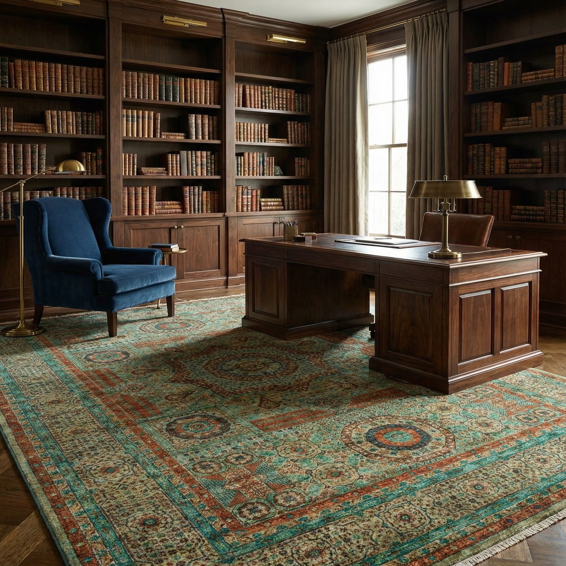 Primary color is Green. Colors in this rug include: Green, Rectangle.