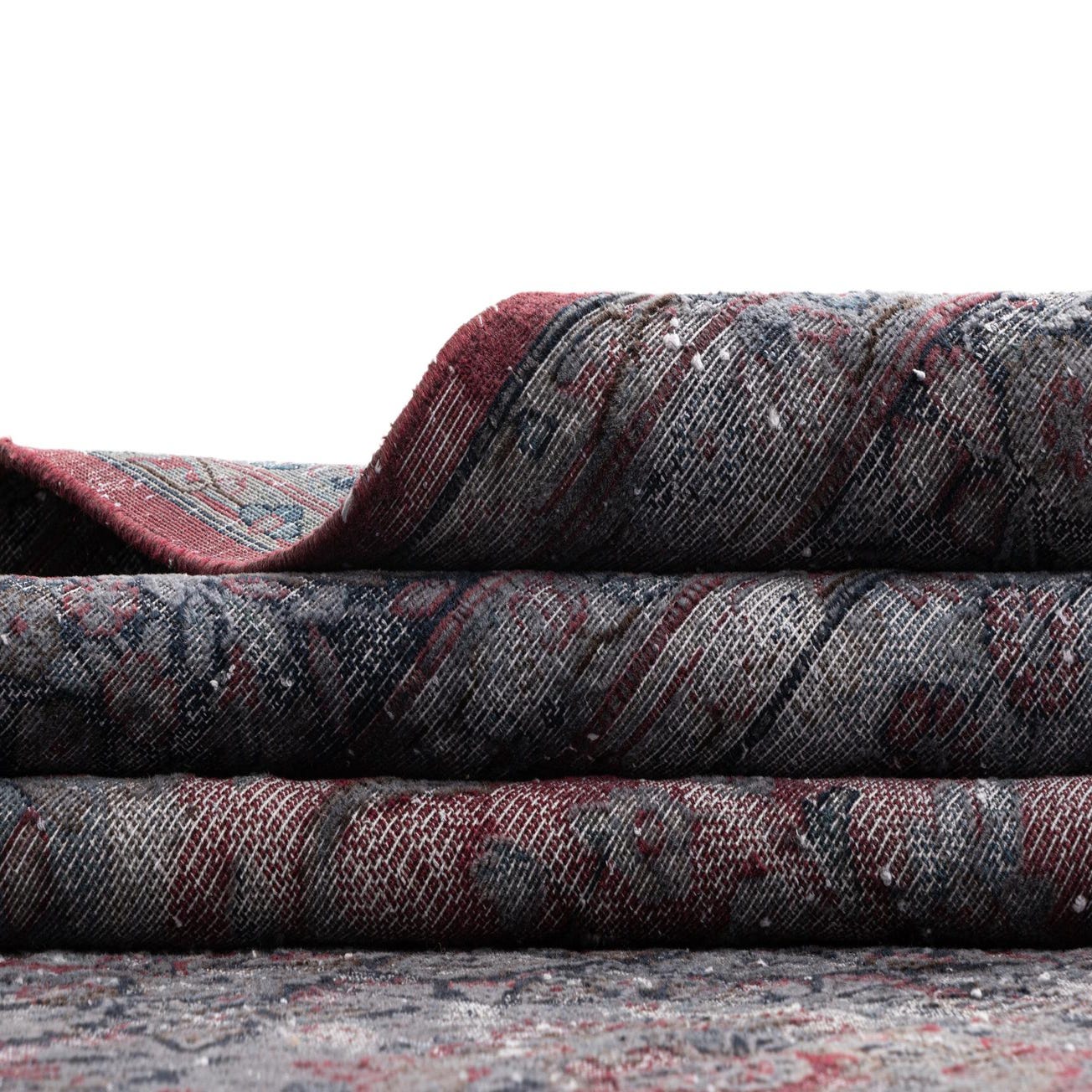 Primary color is Grey. Colors in this rug include: Grey, Grey, Red, Brown, Black.
