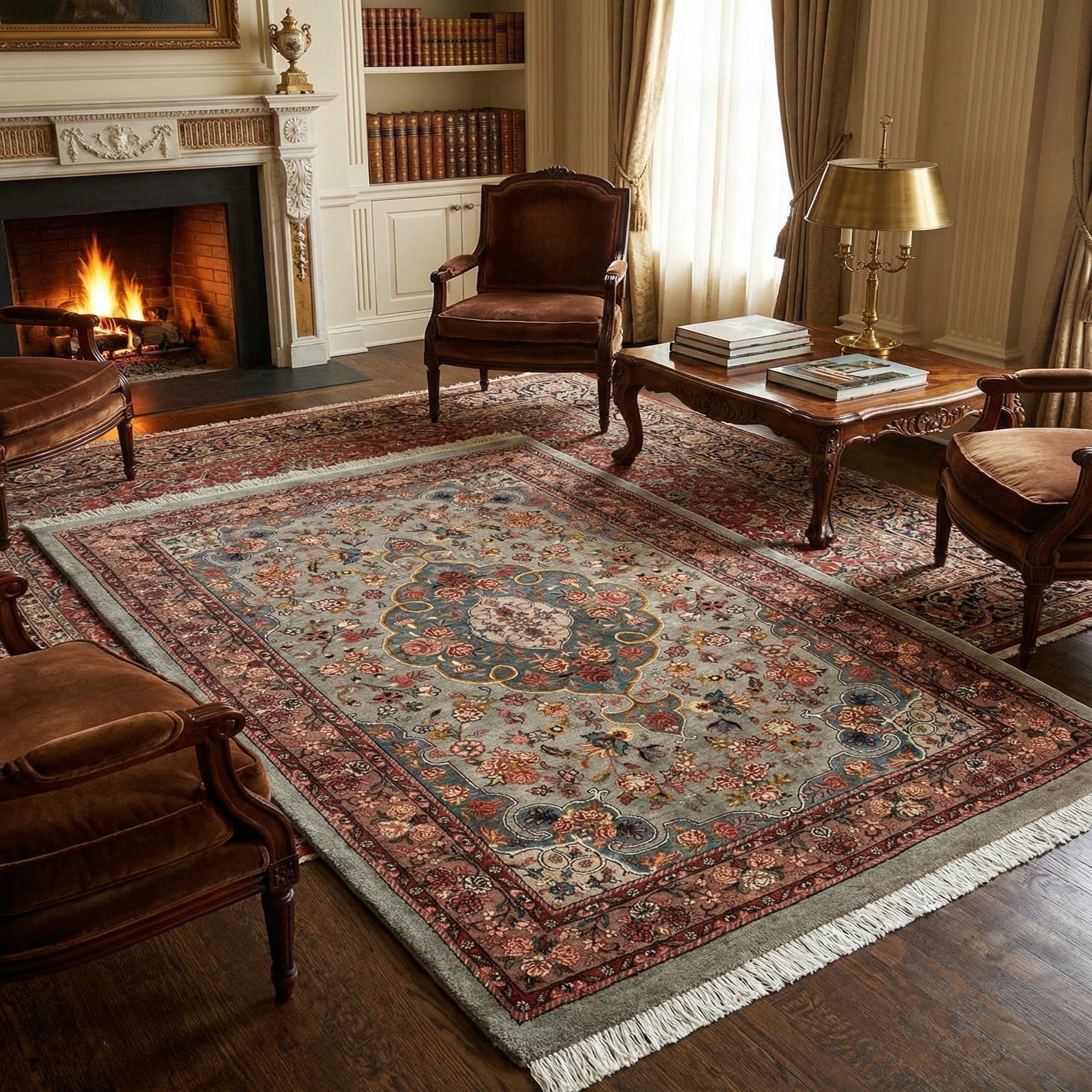 Primary color is Grey. Colors in this rug include: Grey, Grey, Pink, Purple, Blue, Brown, Green, Cream, Black.