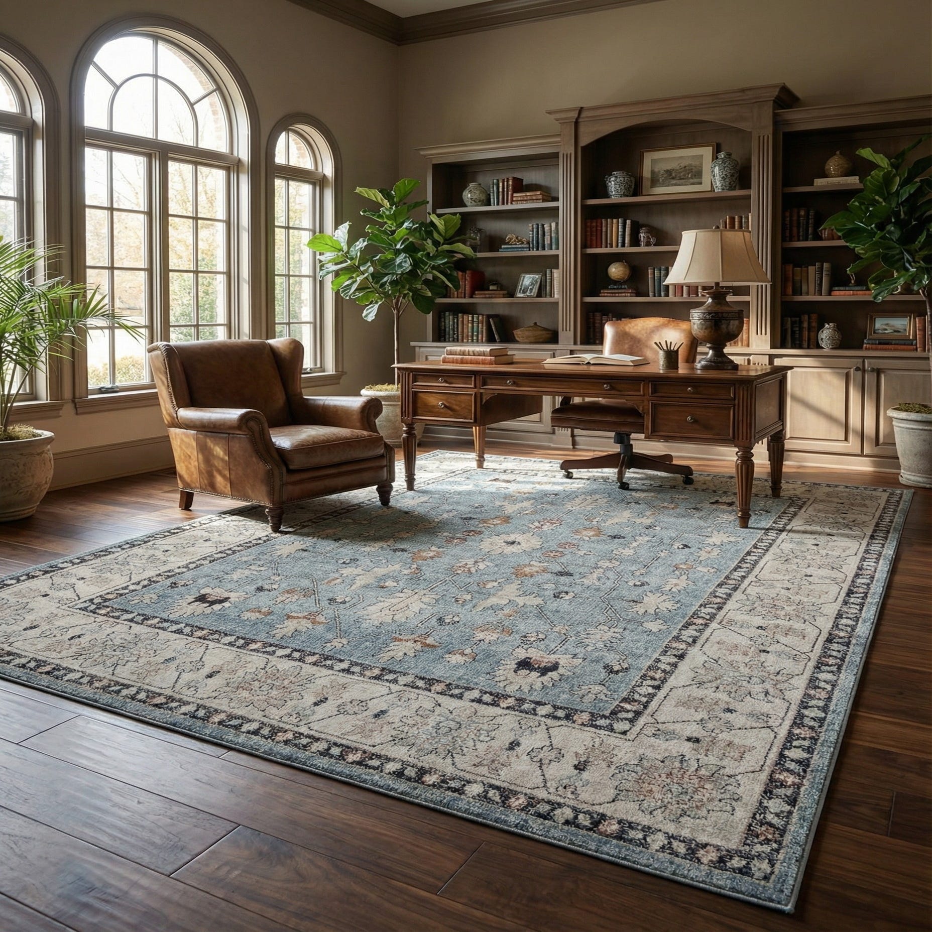 Primary color is Harbor Blue. Colors in this rug include: Harbor Blue, Gray, Ivory, Light Brown, Black.
