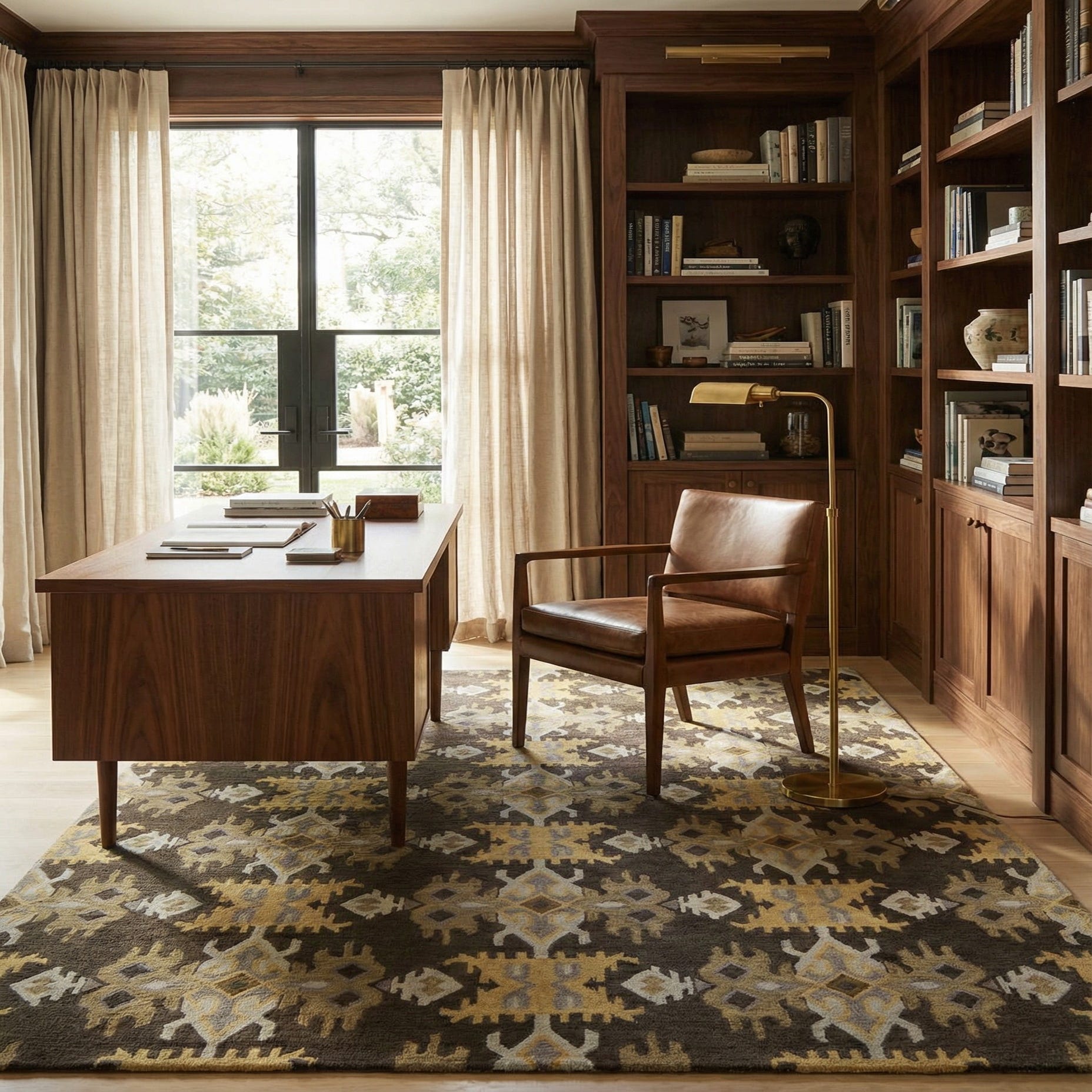 Primary color is Hunter Green. Colors in this rug include: Hunter Green, Black, Gold, Light Blue, Light Green.