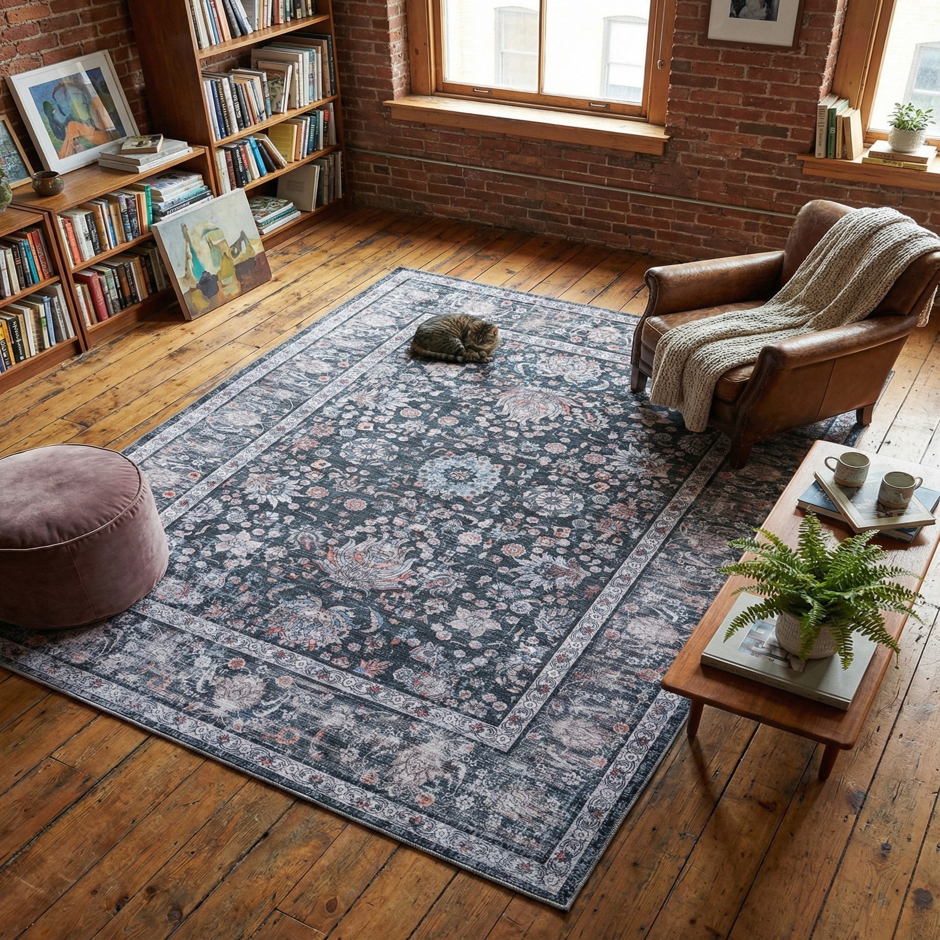 Primary color is Ink Black. Colors in this rug include: Ink Black, Brown, Ivory, Gray, Navy Blue, Red.