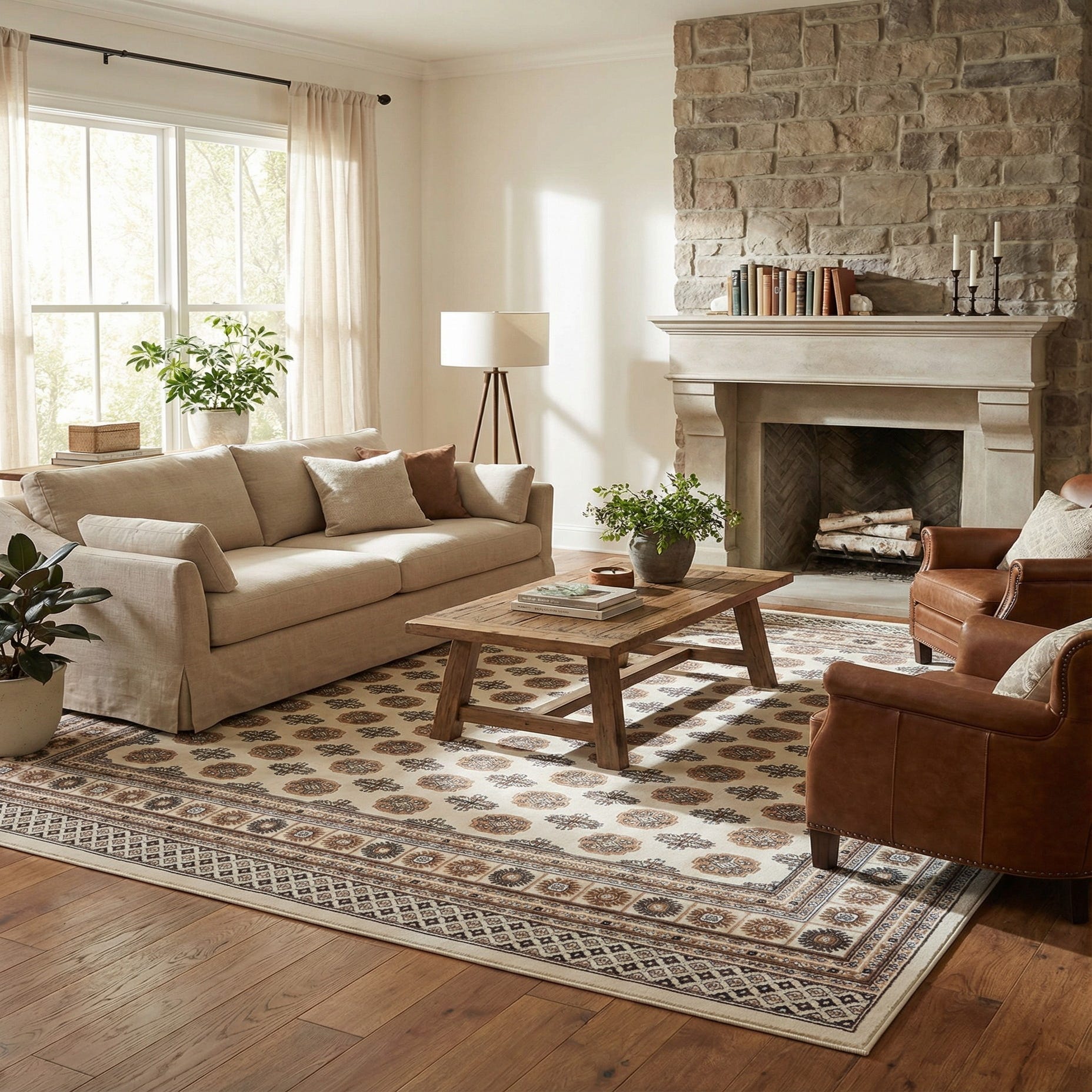 Primary color is Ivory. Colors in this rug include: Ivory, Light Brown, Navy Blue.