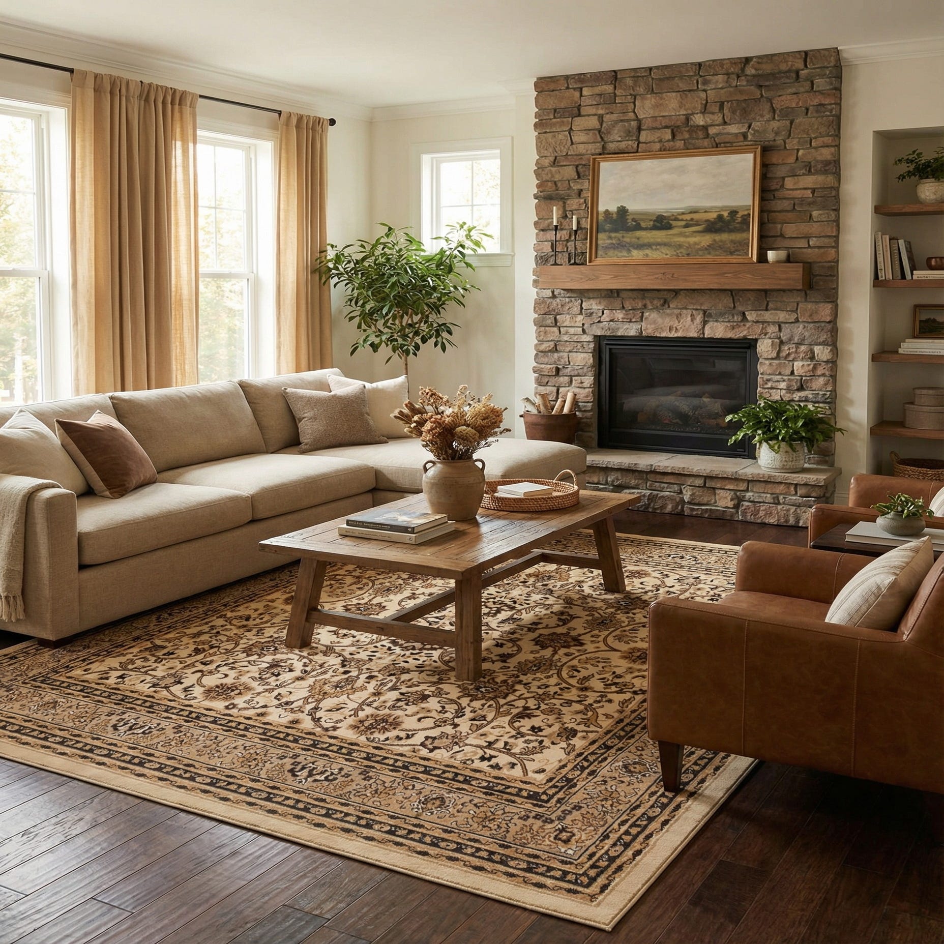 Primary color is Ivory. Colors in this rug include: Ivory, Beige, Black, Brown, Cream, Tan.
