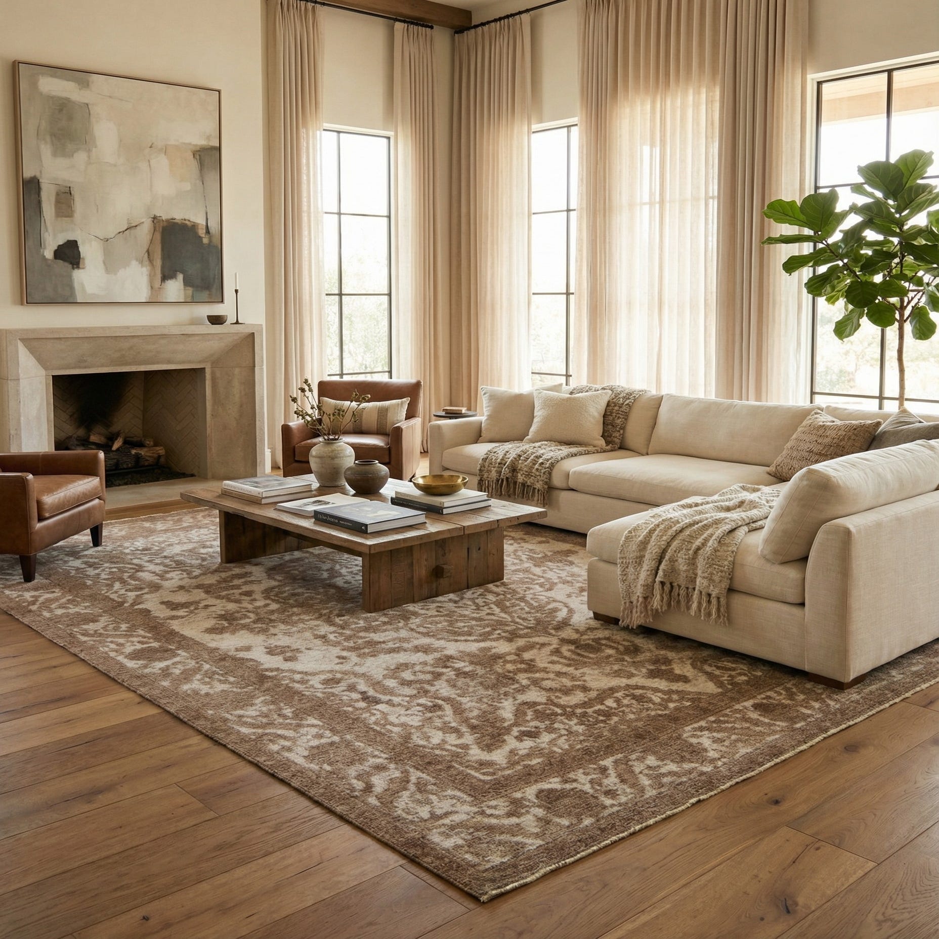 Primary color is Ivory. Colors in this rug include: Ivory, Brown.
