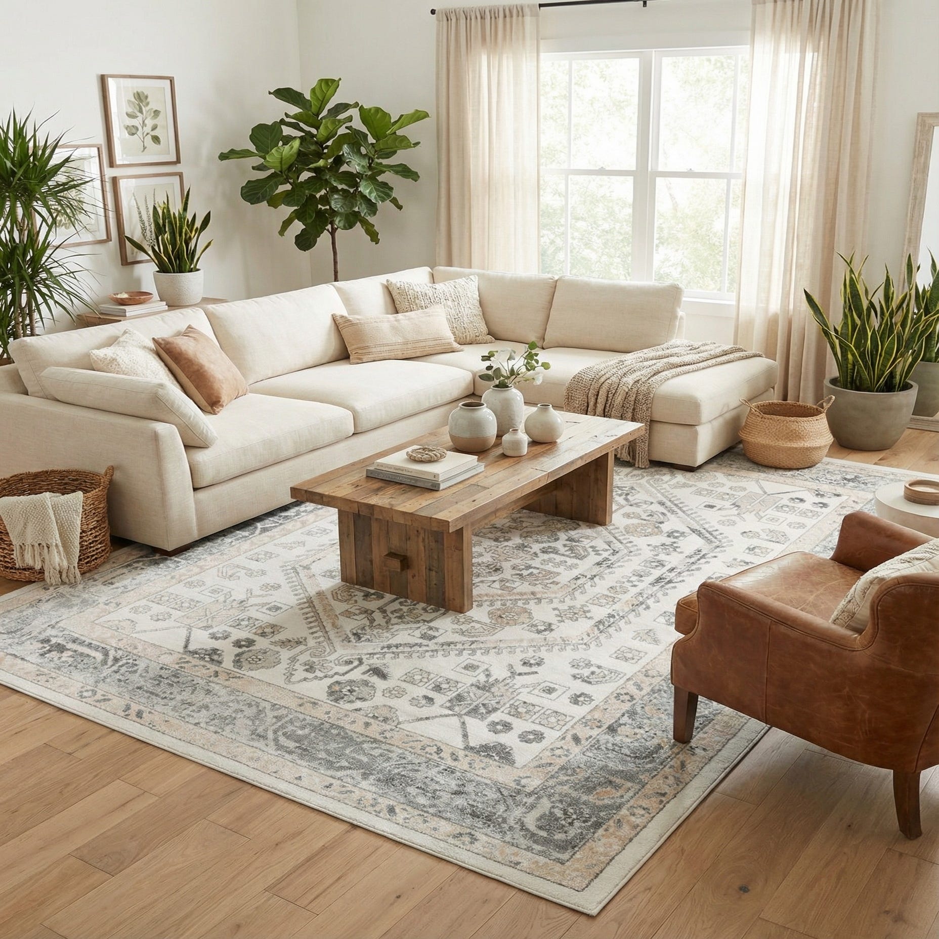 Primary color is Ivory. Colors in this rug include: Ivory, Beige, Black, Gray.