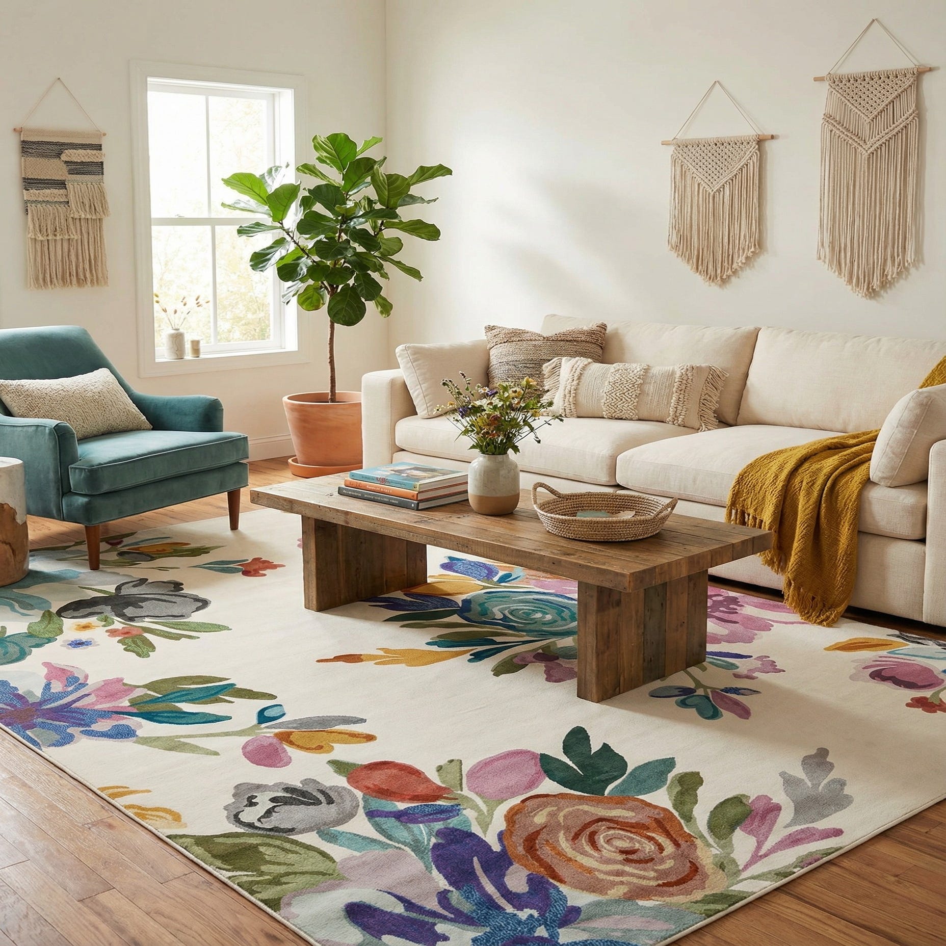 Primary color is Ivory. Colors in this rug include: Ivory, Black, Blue, Gray, Light Blue, Olive, Purple, Yellow, Pink.