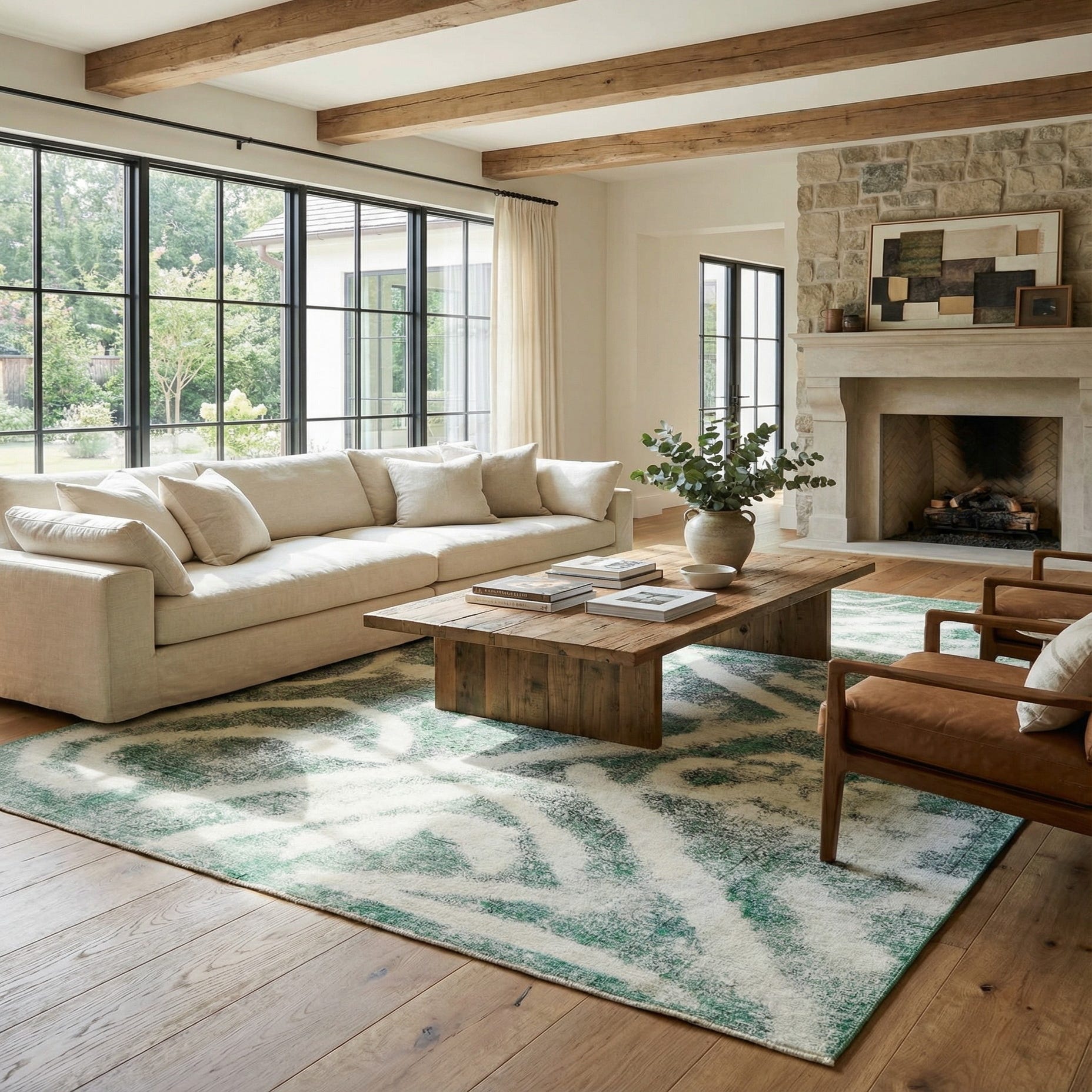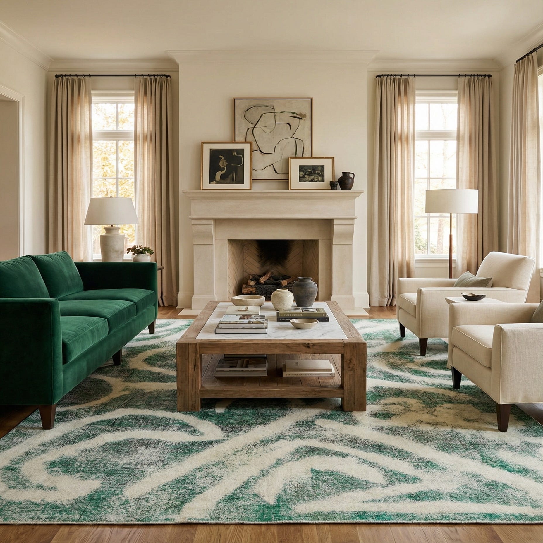 Primary color is Ivory. Colors in this rug include: Ivory, Black, Green.
