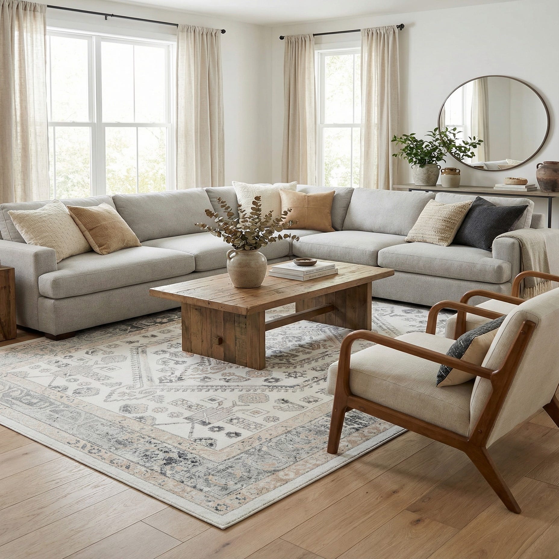 Primary color is Ivory. Colors in this rug include: Ivory, Beige, Black, Gray.