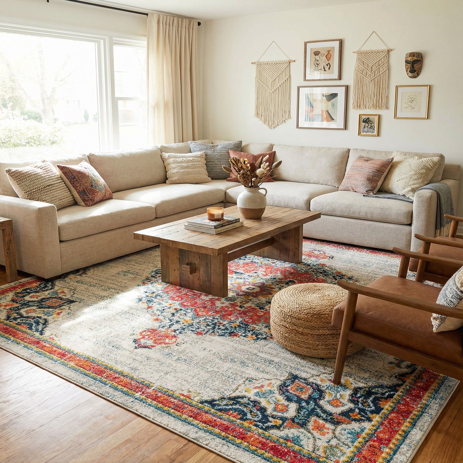 Primary color is Ivory. Colors in this rug include: Ivory, Black, Blue, Gold, Green, Orange, Red, Pink.