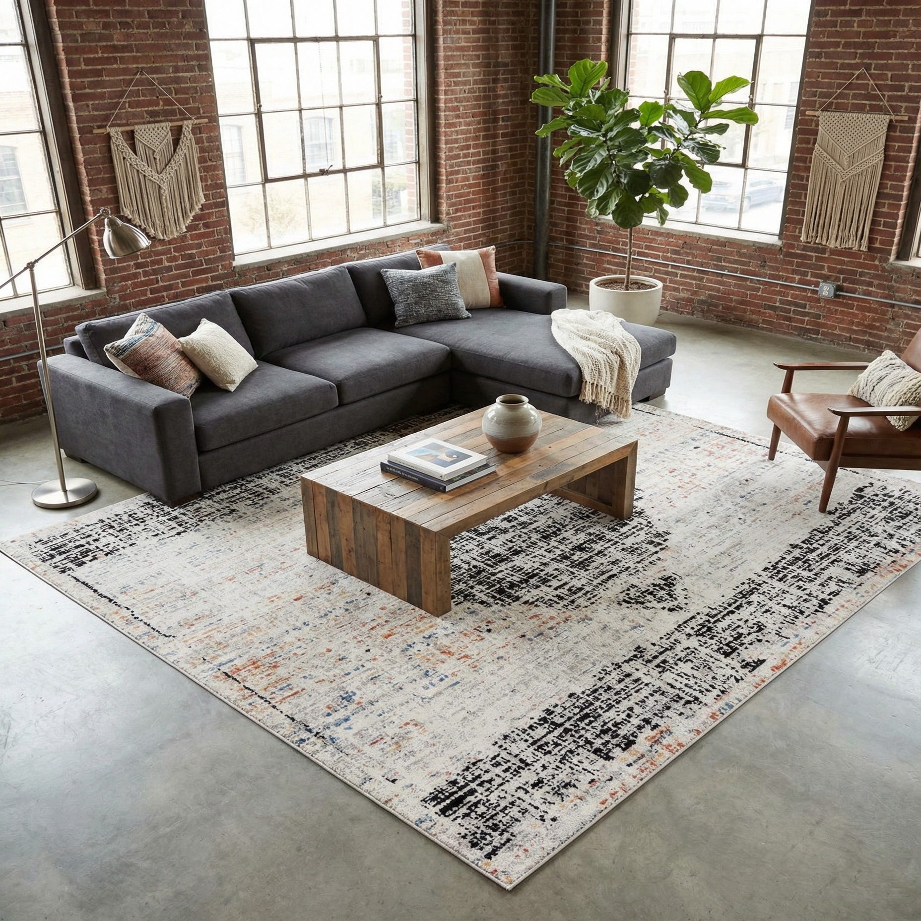 Primary color is Ivory. Colors in this rug include: Ivory, Black, Light Blue, Orange, Rust Red.