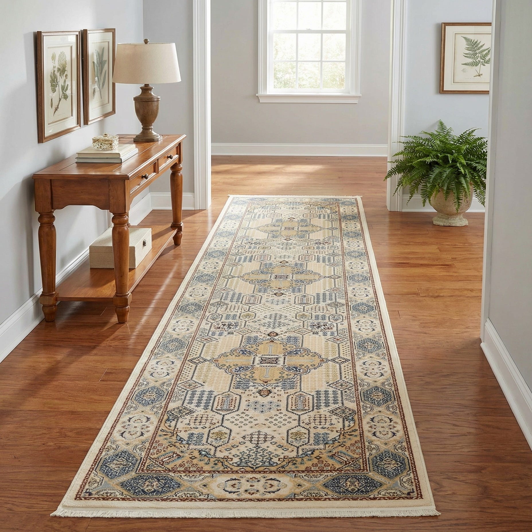 Primary color is Ivory. Colors in this rug include: Ivory, Beige, Blue, Burgundy, Cream, Green, Navy Blue, Puce.