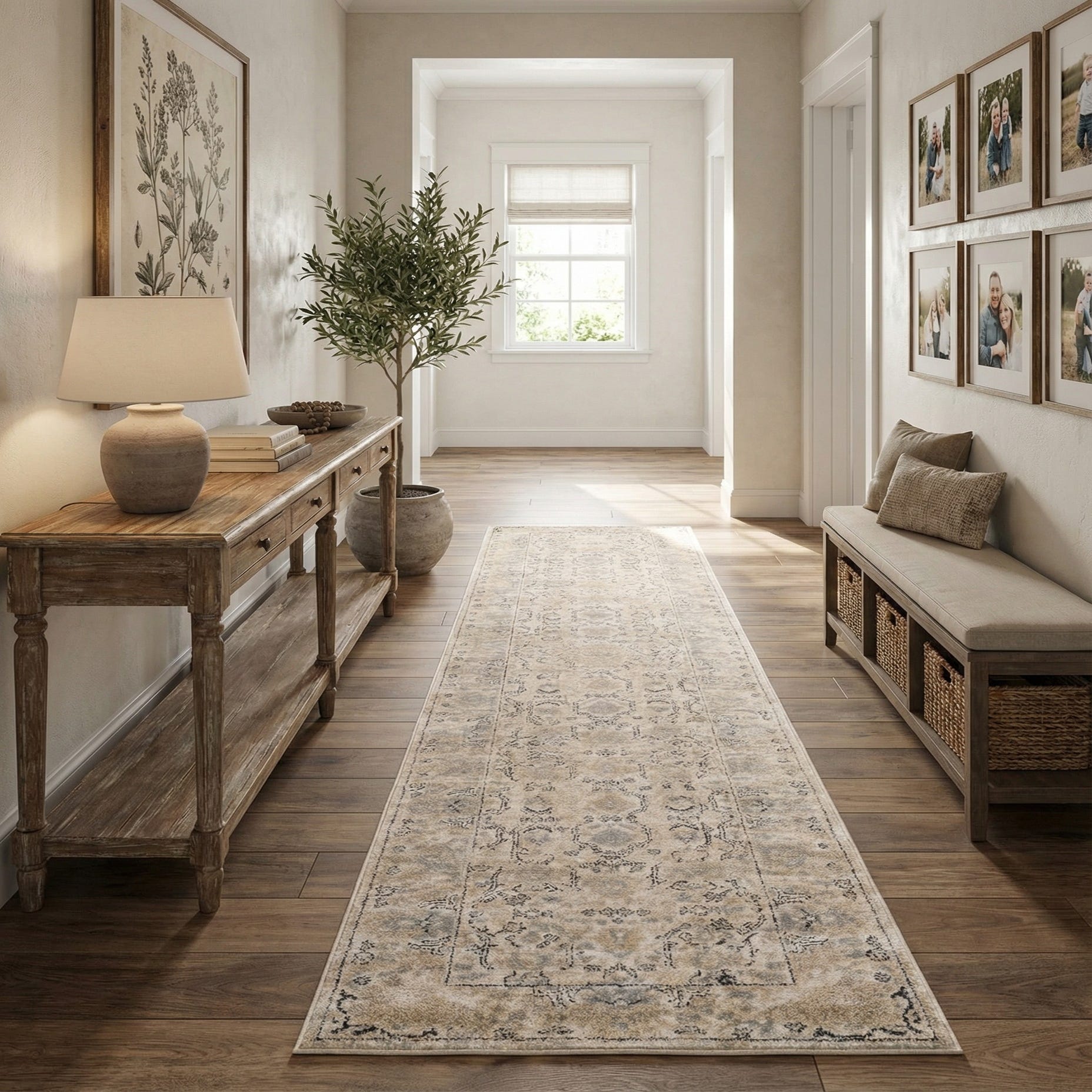 Primary color is Ivory. Colors in this rug include: Ivory, Gray, Beige, Tan.