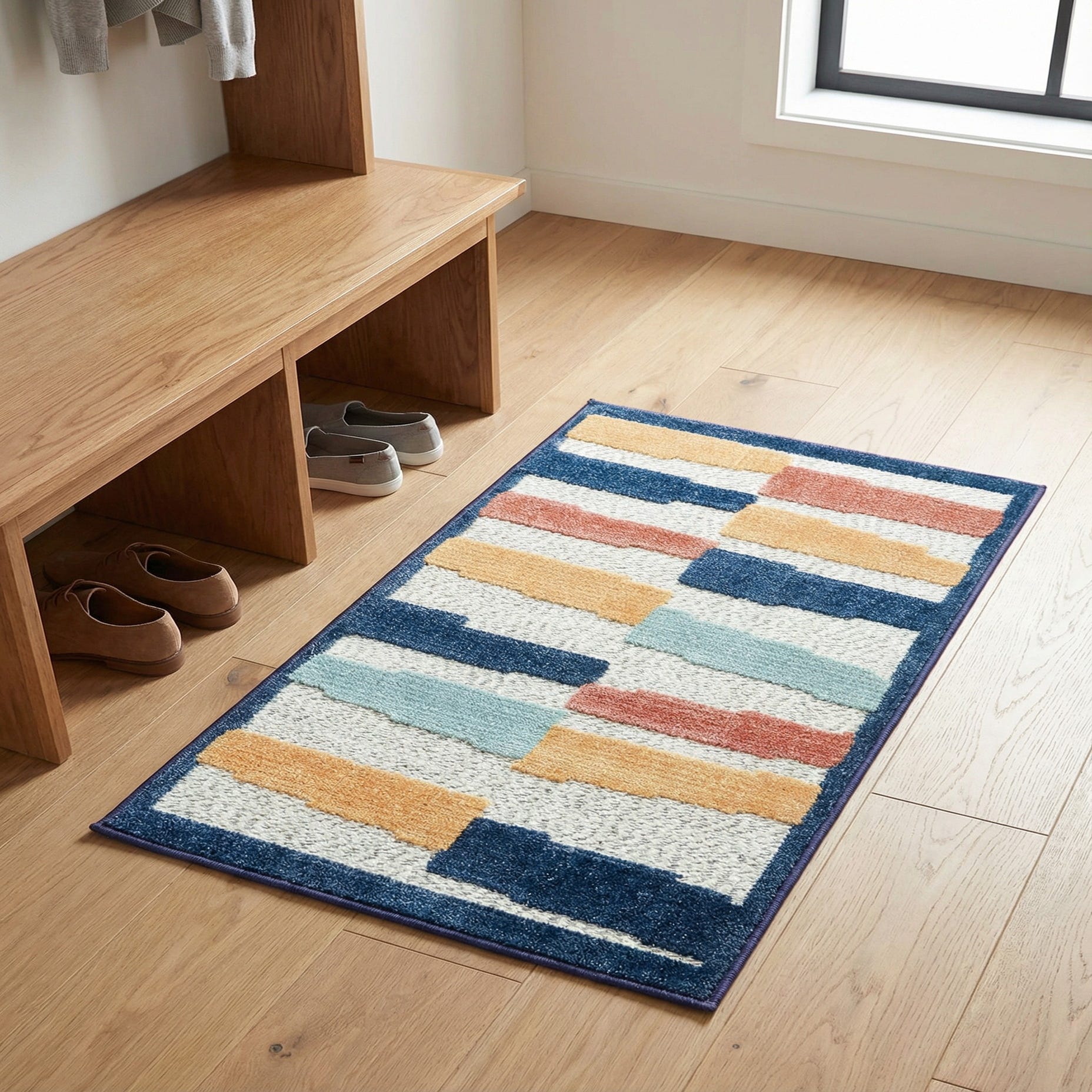 Primary color is Ivory. Colors in this rug include: Ivory, Navy Blue, Yellow, Rust Red, Light Blue.