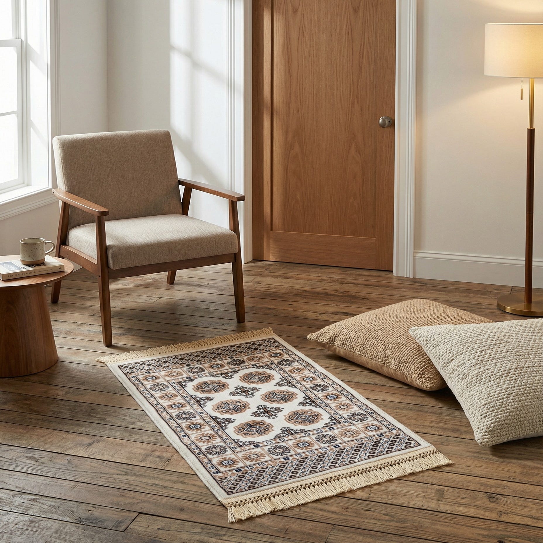 Primary color is Ivory. Colors in this rug include: Ivory, Light Brown, Navy Blue.