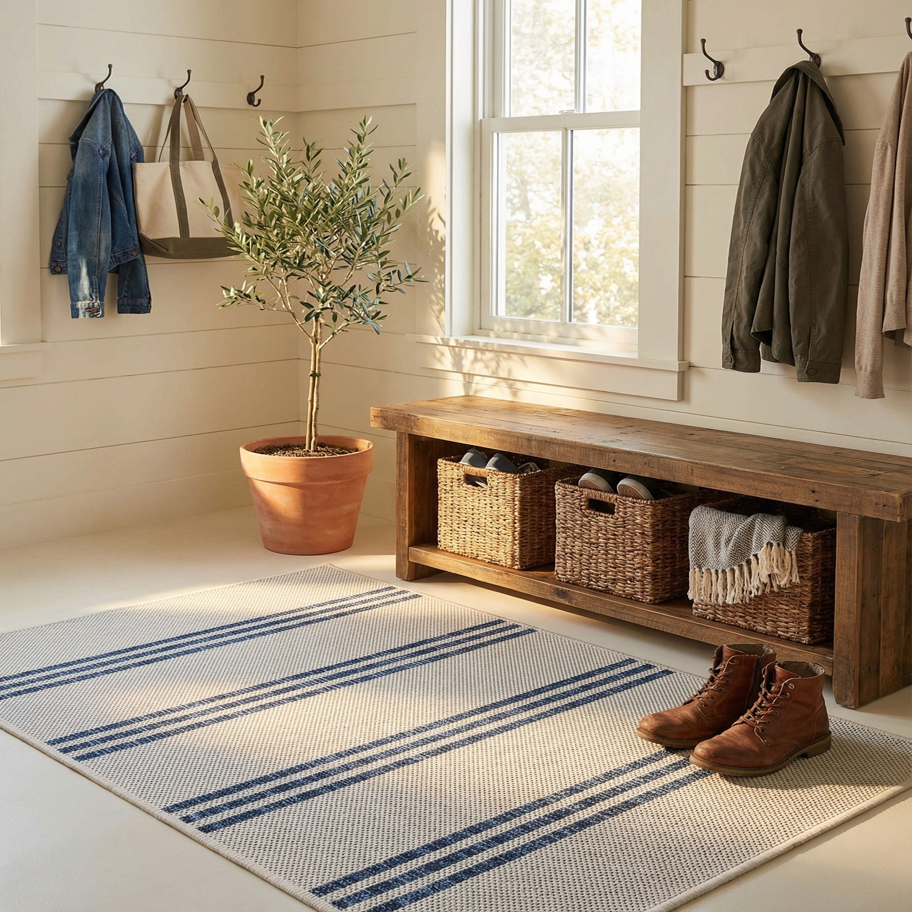 Primary color is Ivory. Colors in this rug include: Ivory, Blue.