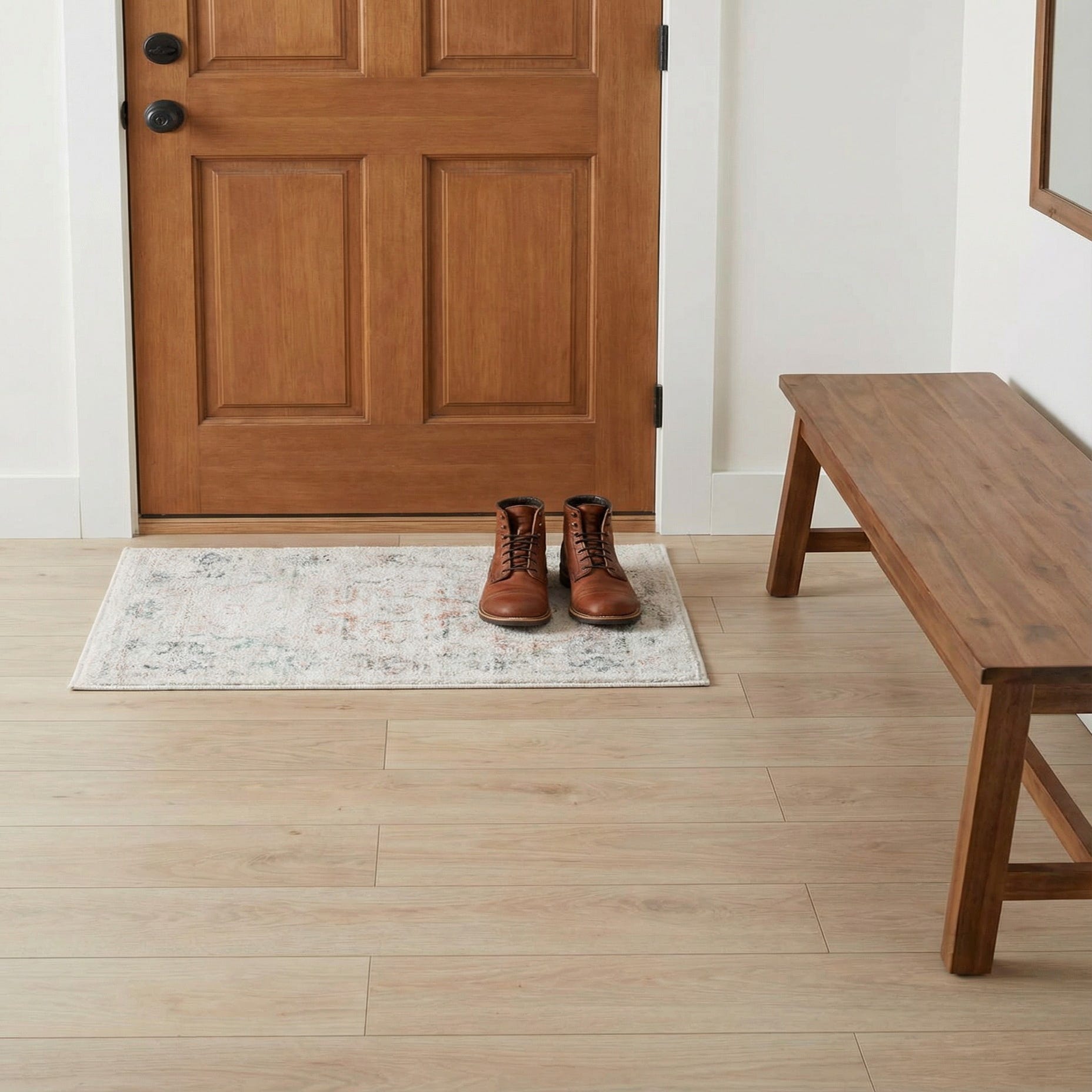 Primary color is Ivory. Colors in this rug include: Ivory, Gray, Pink.