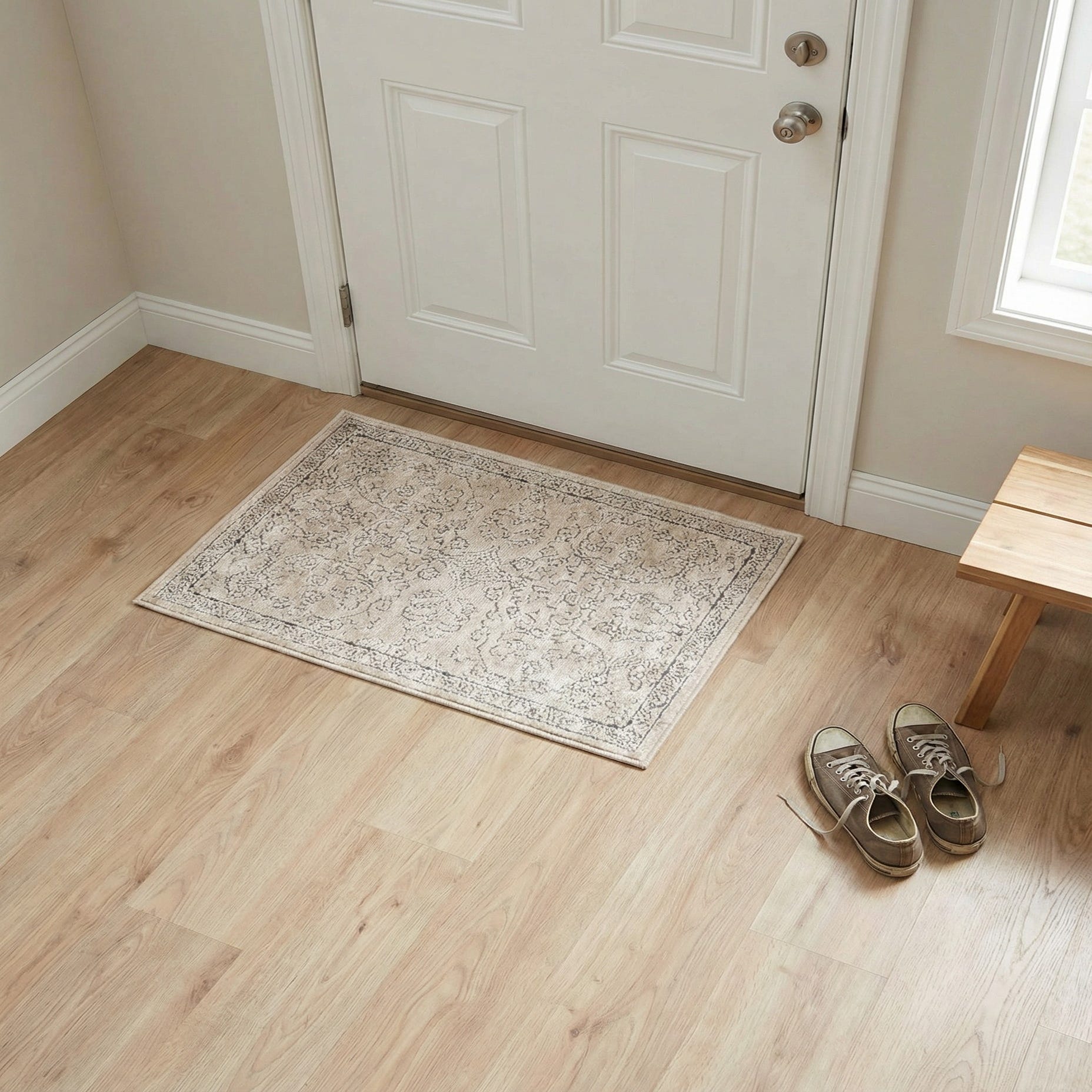 Primary color is Ivory. Colors in this rug include: Ivory, Beige, Gray.