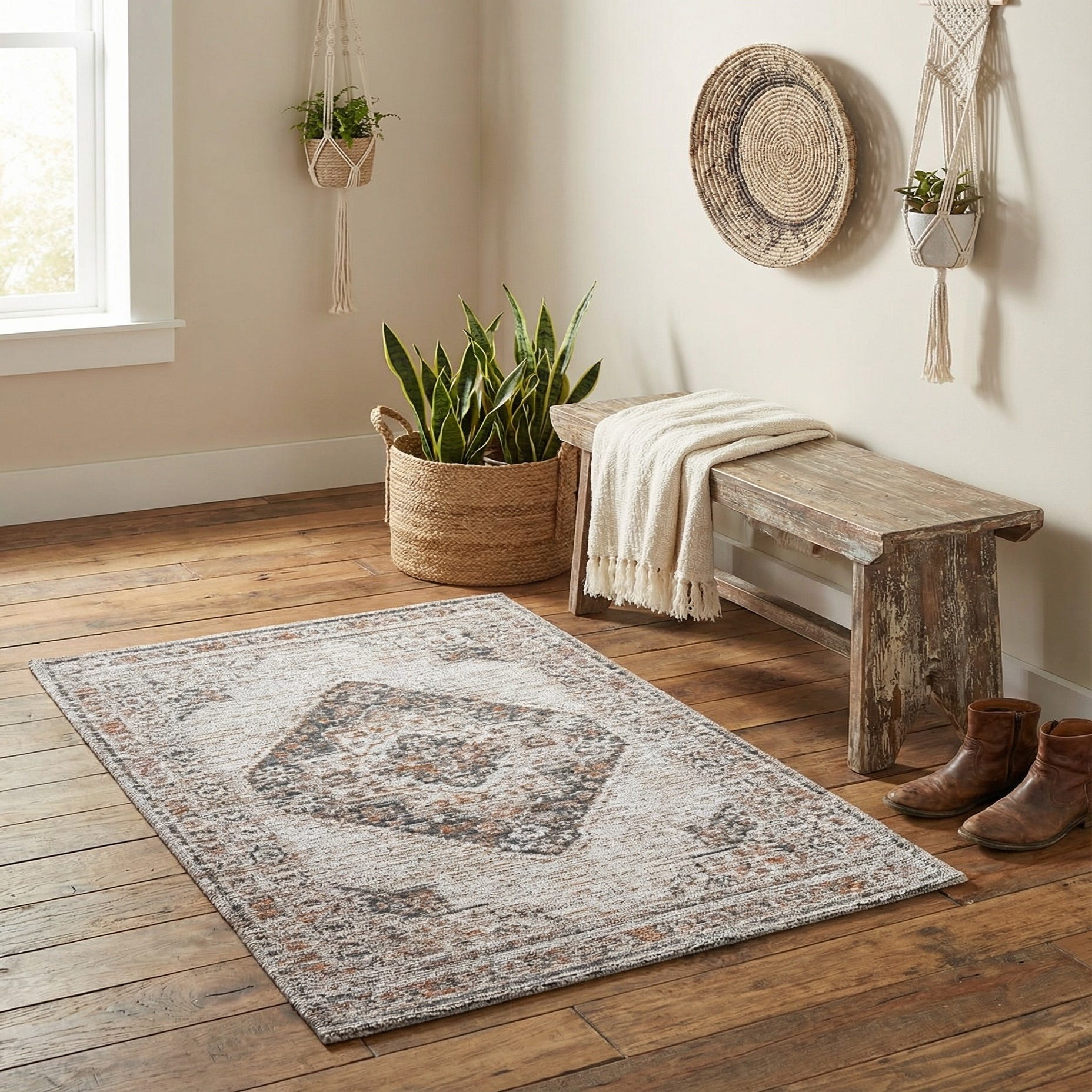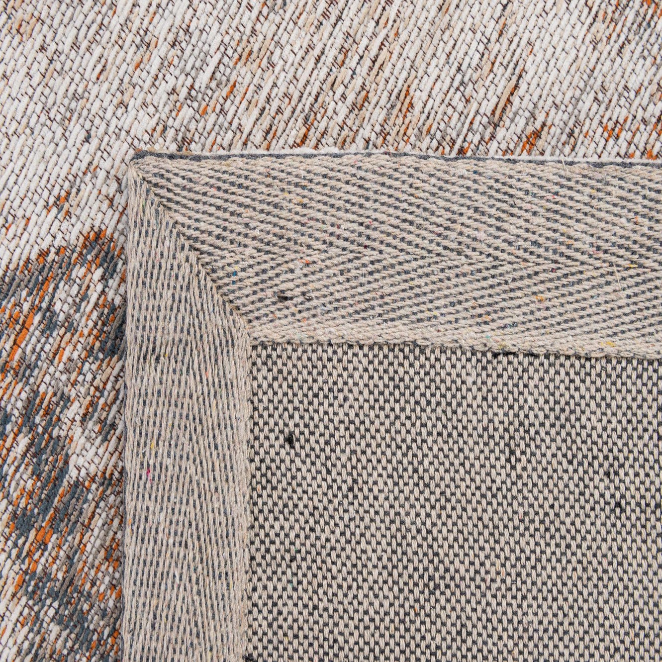 Primary color is Ivory. Colors in this rug include: Ivory, Beige, Black, Blue, Brown, Orange.