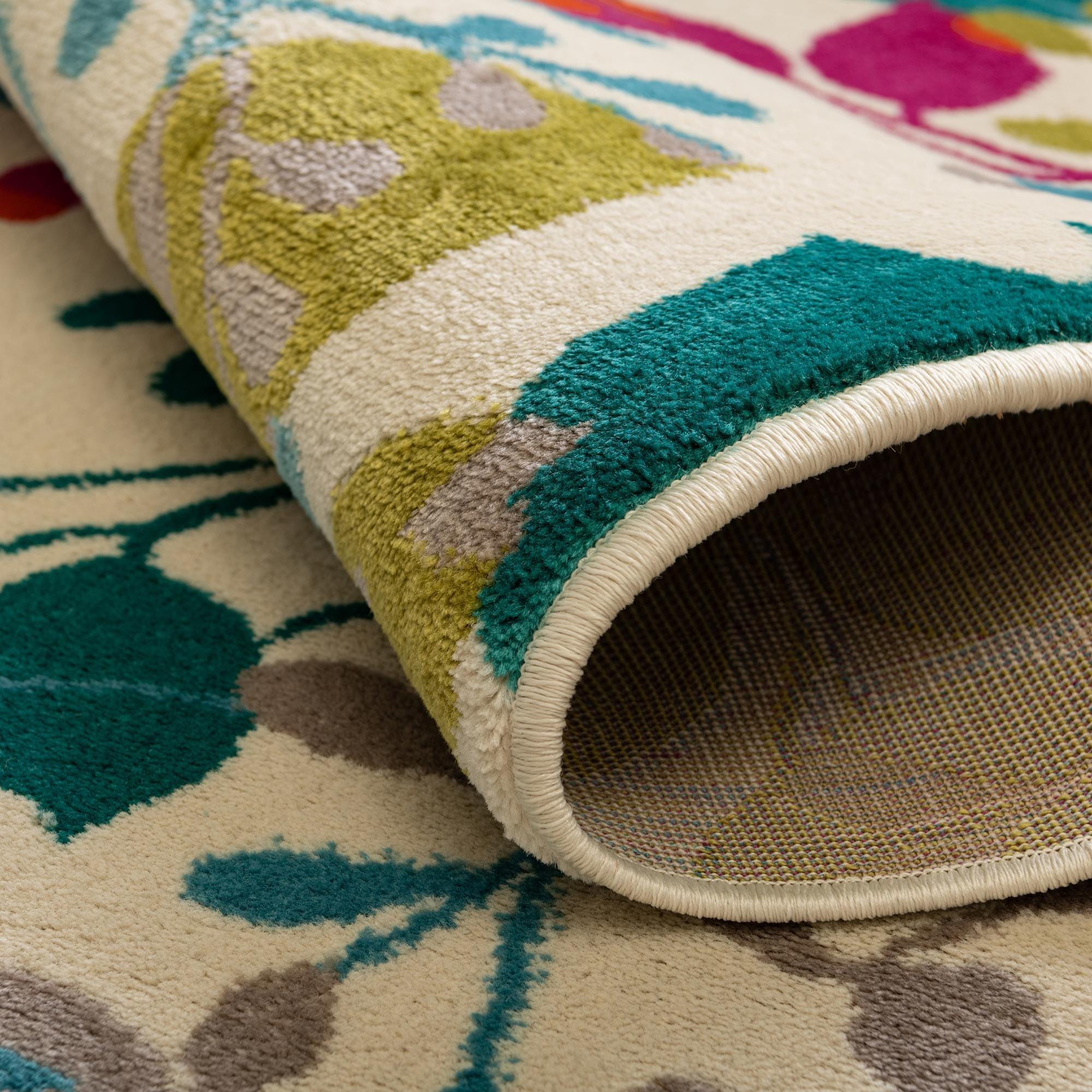 Primary color is Ivory. Colors in this rug include: Ivory, Blue, Gray, Green, Light Blue, Purple, Pink, Orange.