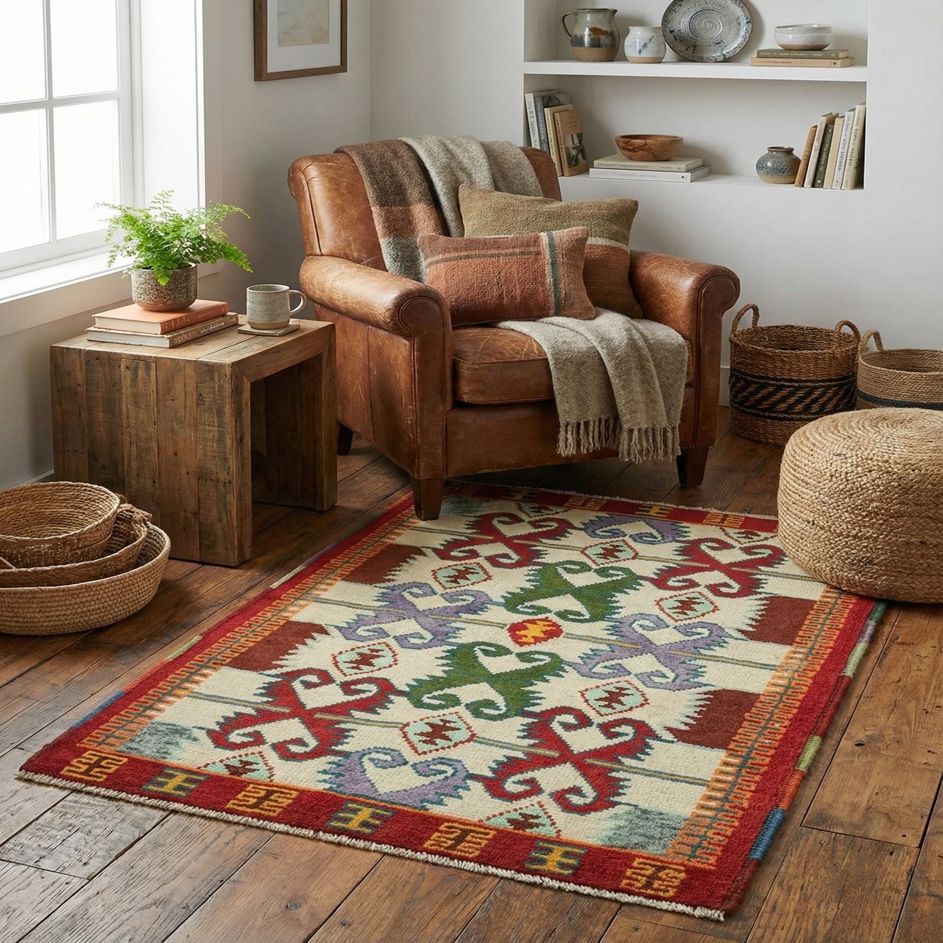 Primary color is Ivory. Colors in this rug include: Ivory, Blue, Hunter Green, Orange, Purple, Burgundy.