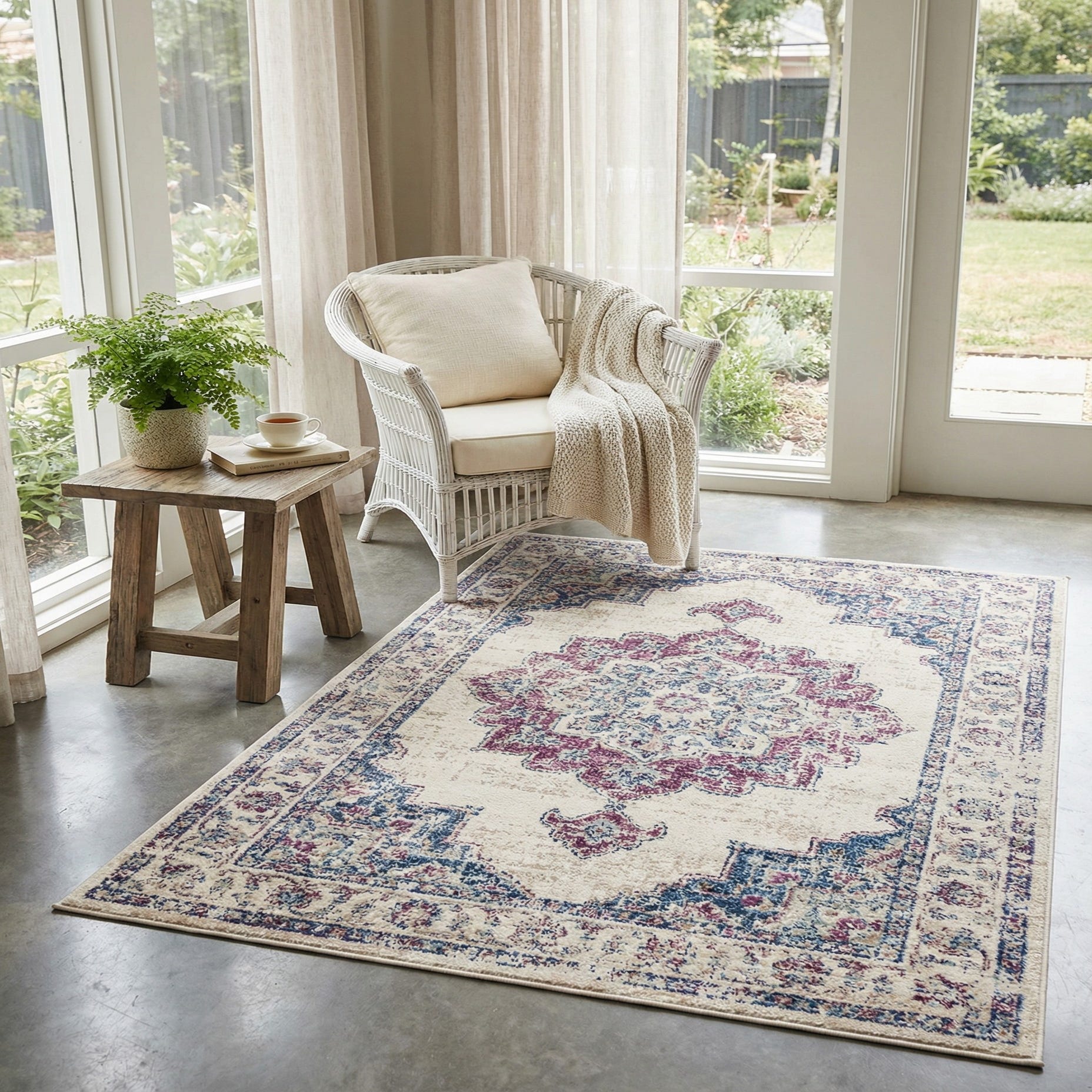 Primary color is Ivory. Colors in this rug include: Ivory, Blue, Gold, Light Blue, Purple.
