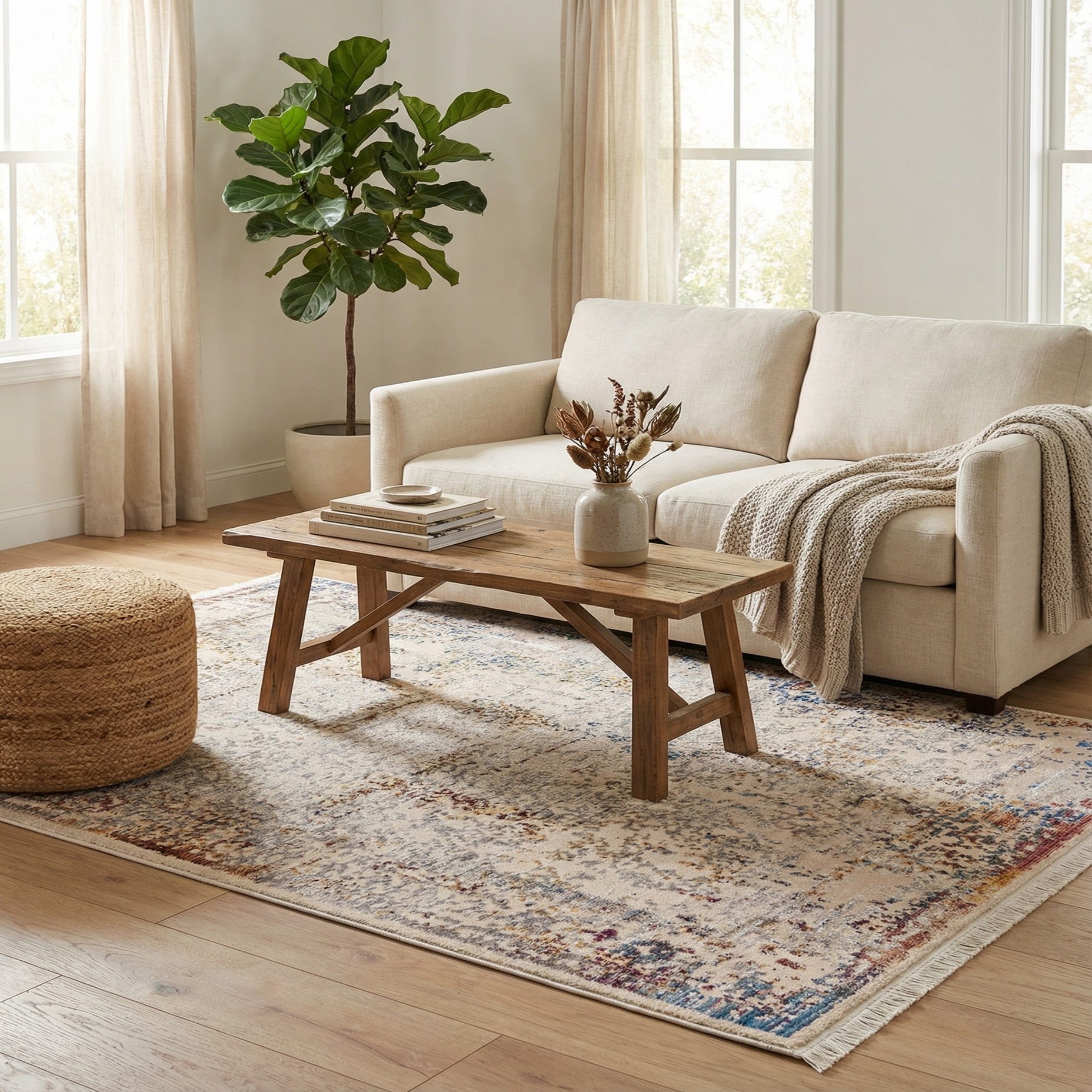 Primary color is Ivory. Colors in this rug include: Ivory, Beige, Blue, Light Blue, Purple, Plum Red.