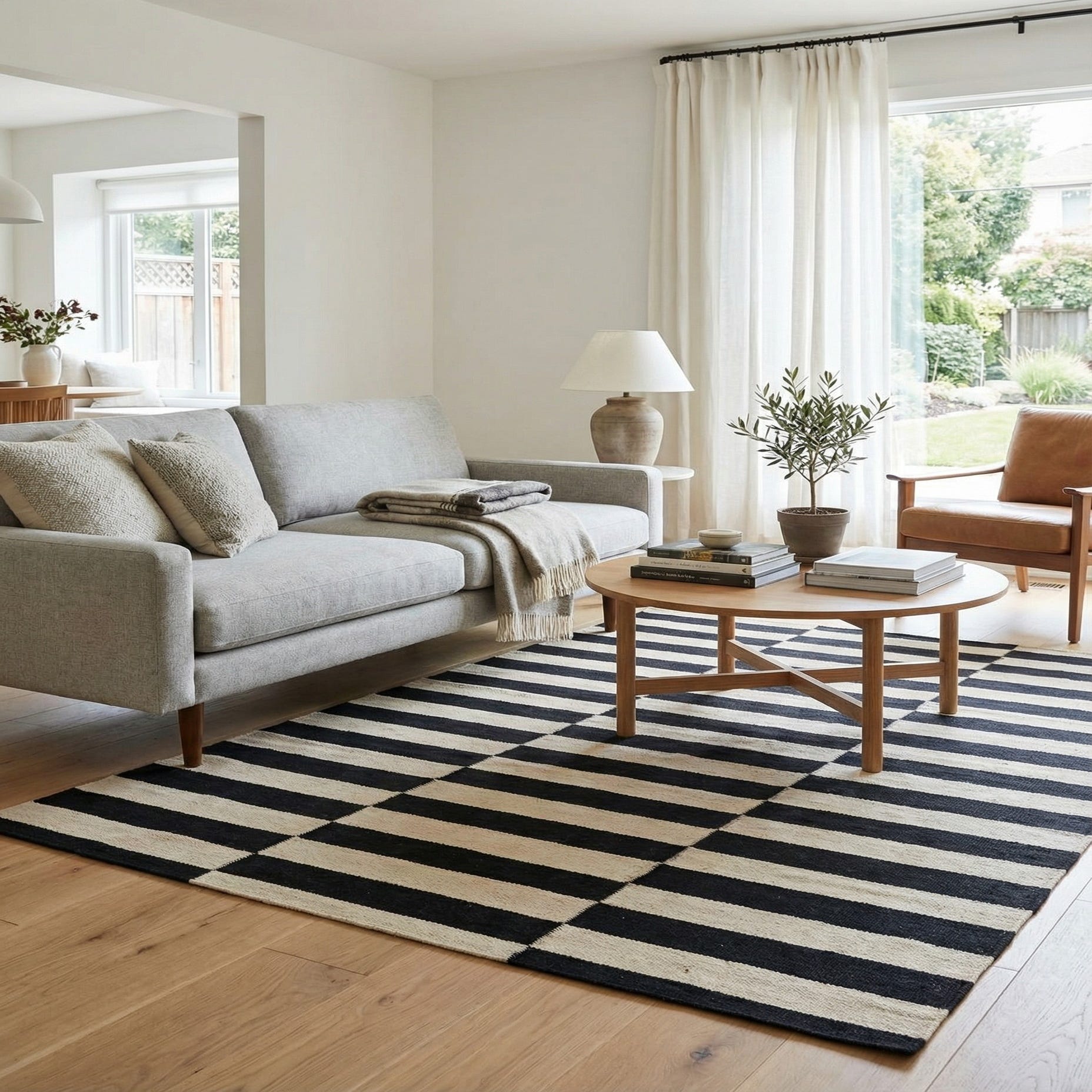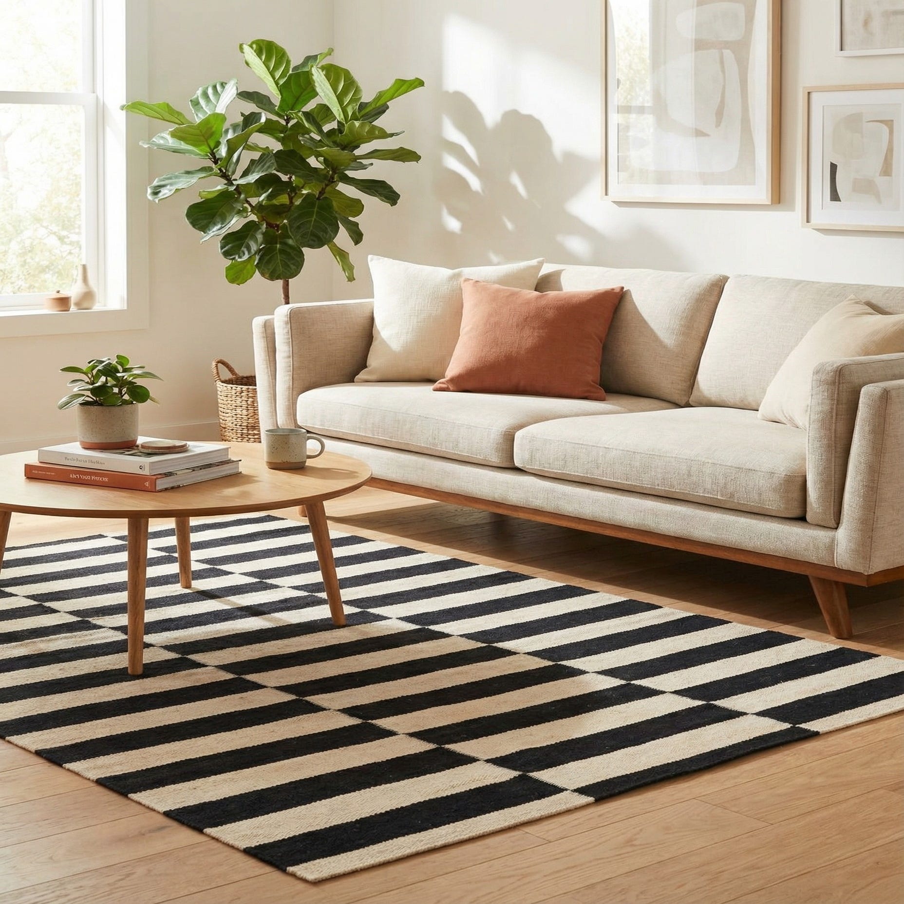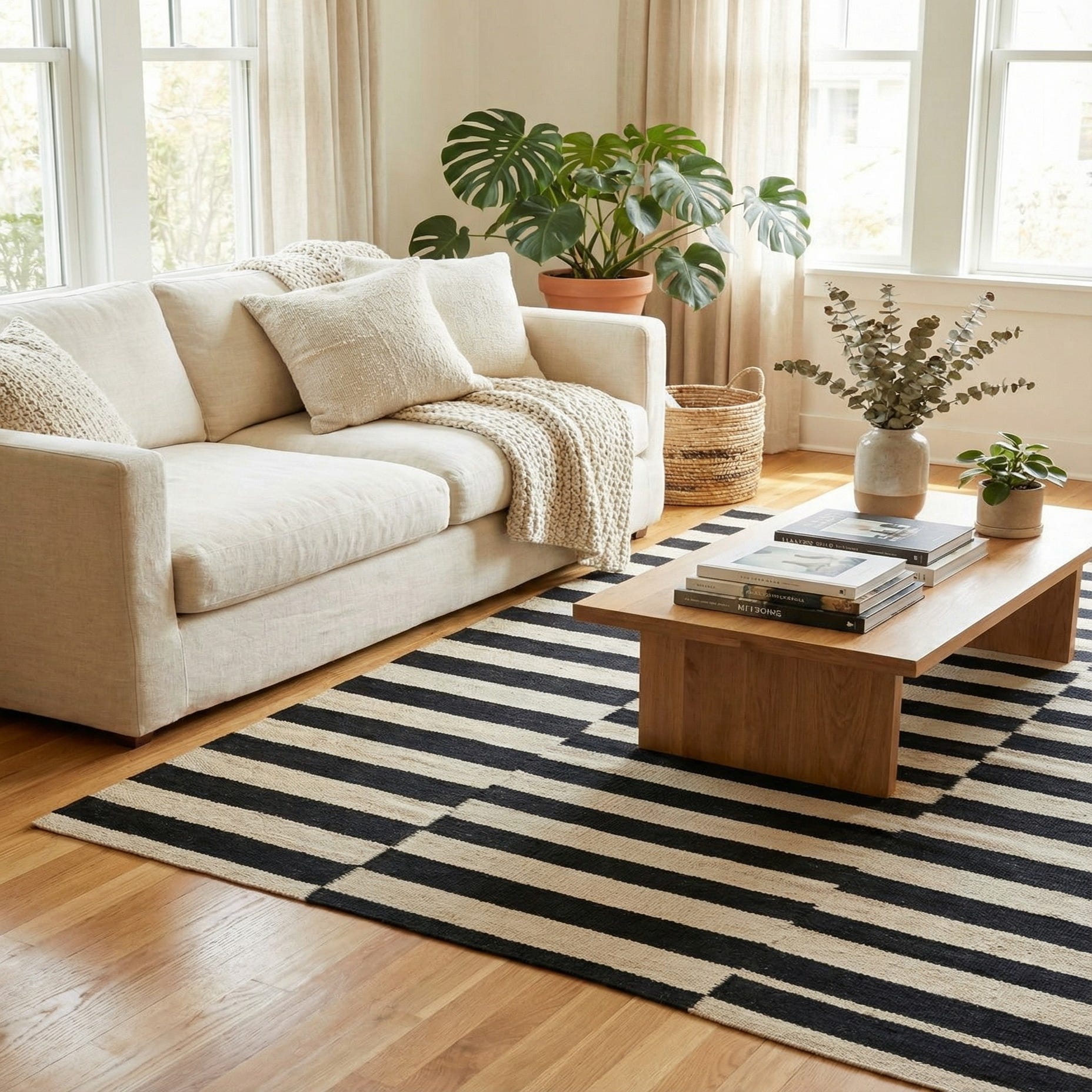 Primary color is Ivory. Colors in this rug include: Ivory, Black.