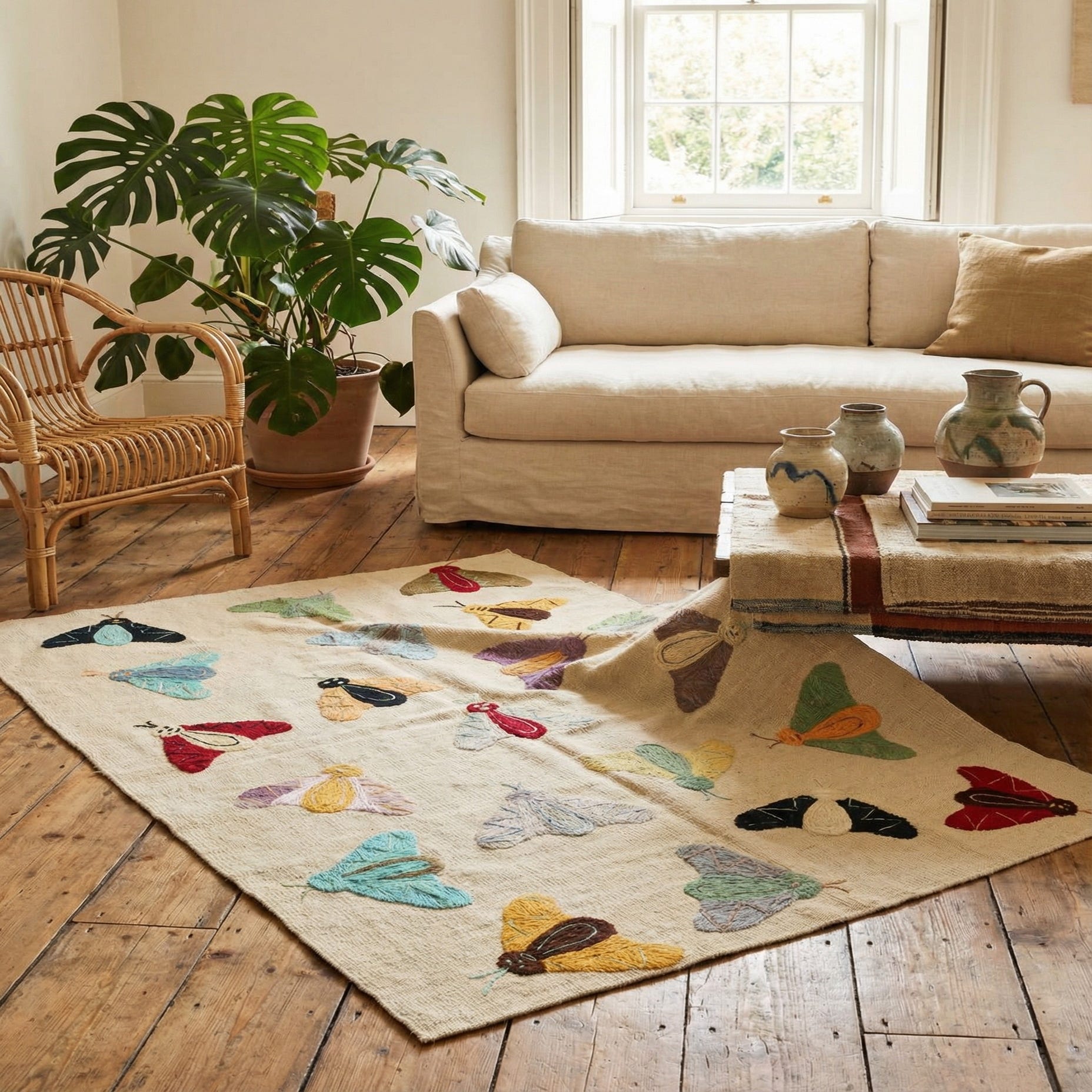 Primary color is Ivory. Colors in this rug include: Ivory, Black, Olive, Orange, Red, Violet, Green.