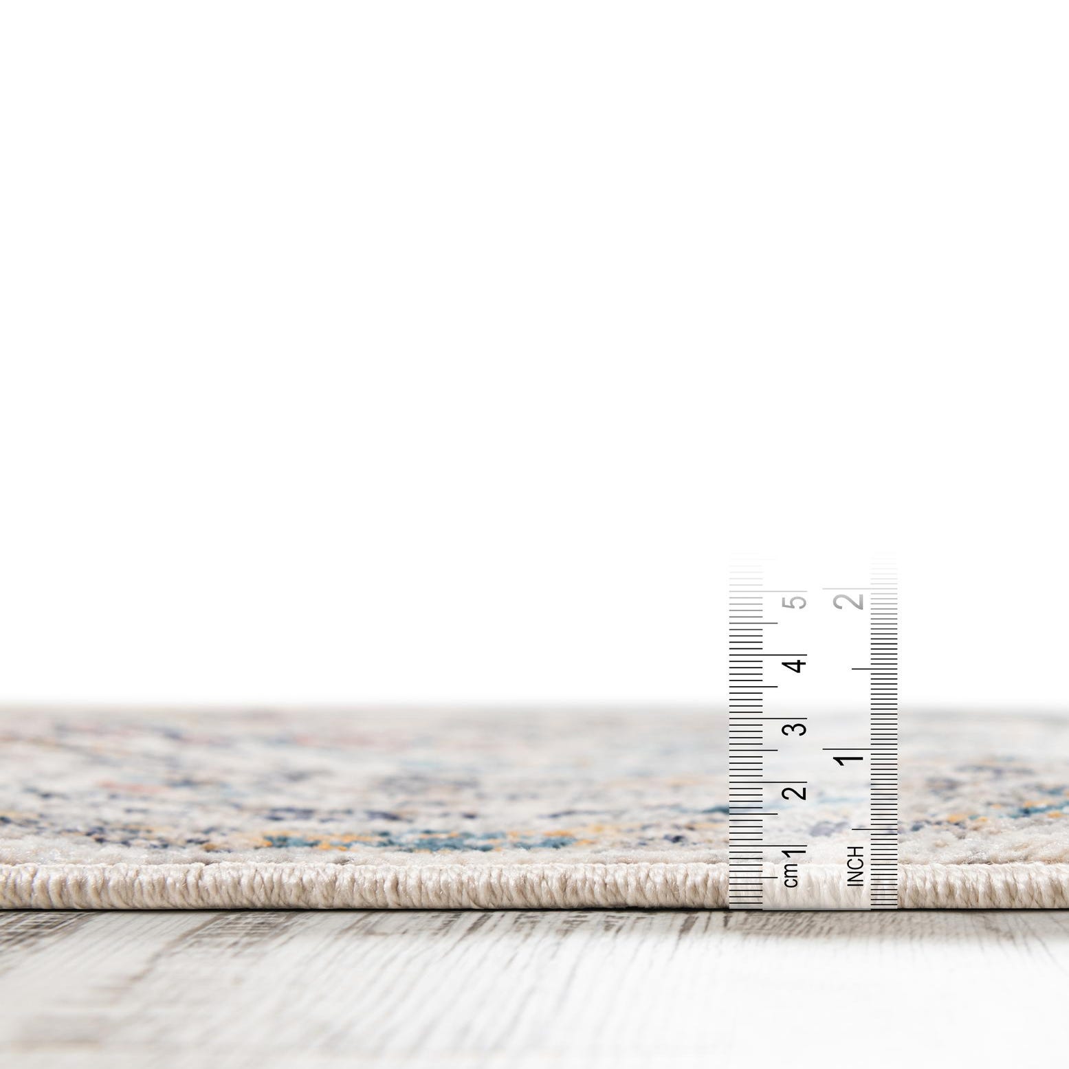 Primary color is Ivory. Colors in this rug include: Ivory, Blue, Light Blue, Light Brown, Navy Blue, Rust Red, Terracotta.