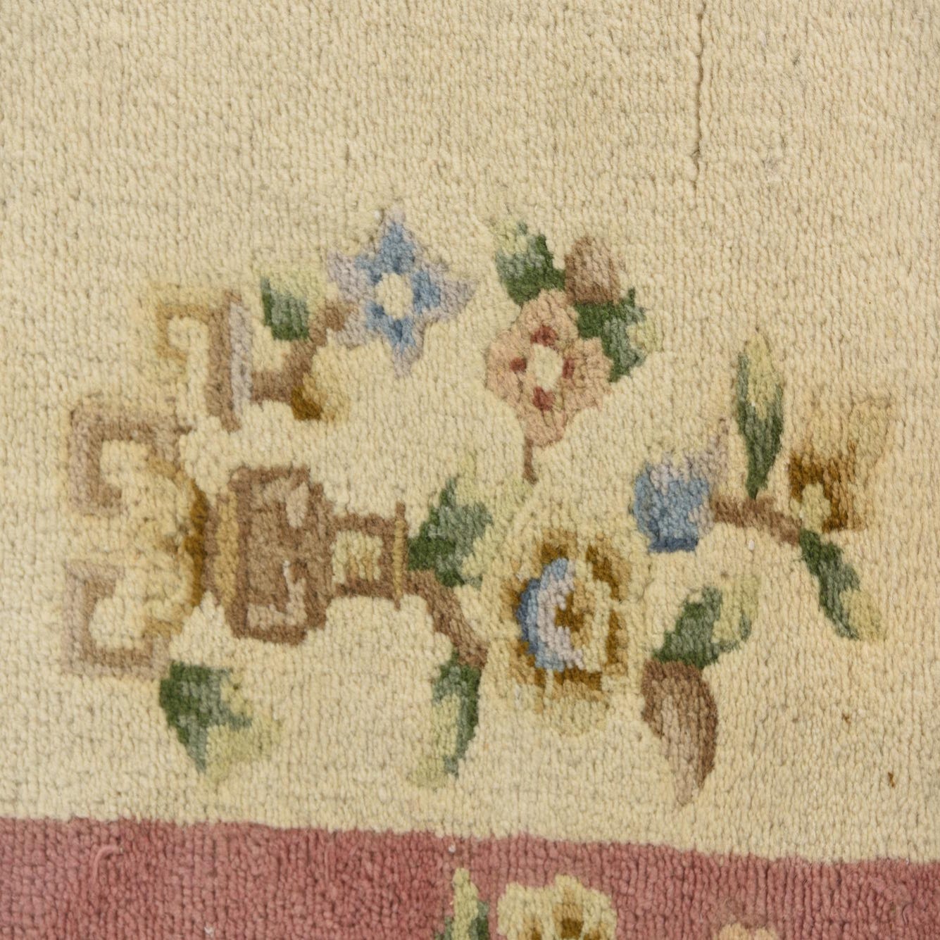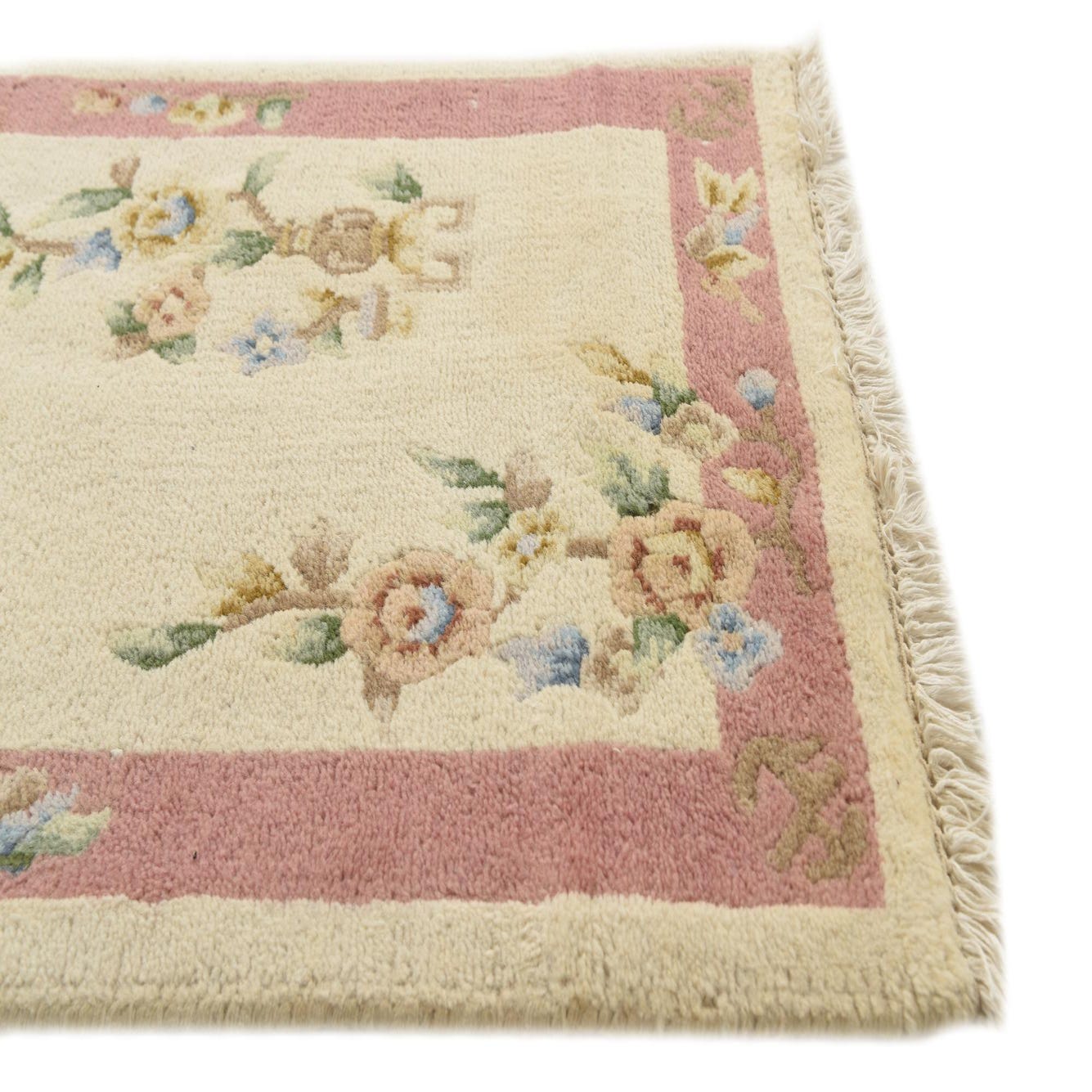 Primary color is Ivory. Colors in this rug include: Ivory, Brown, Pink, Green, Blue.
