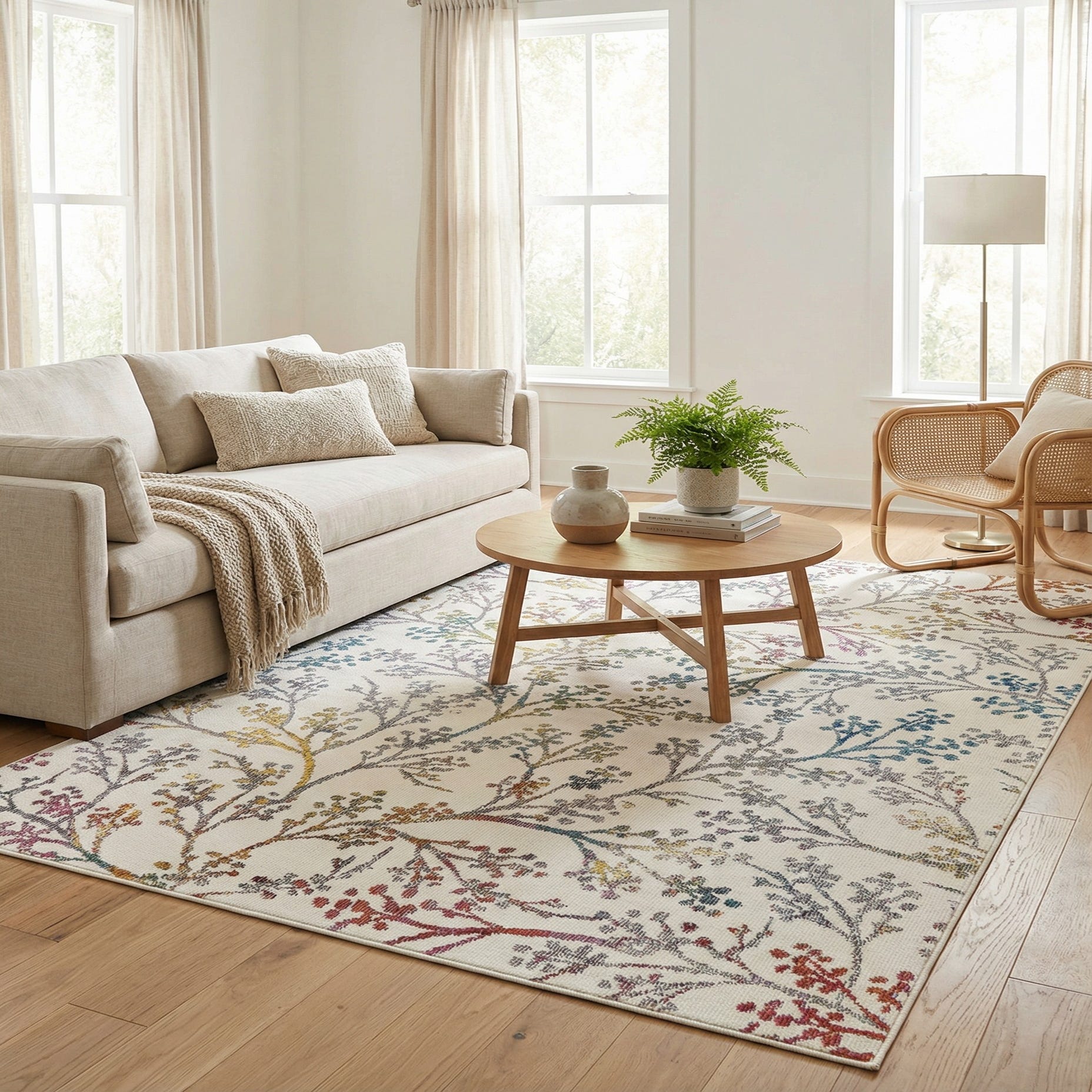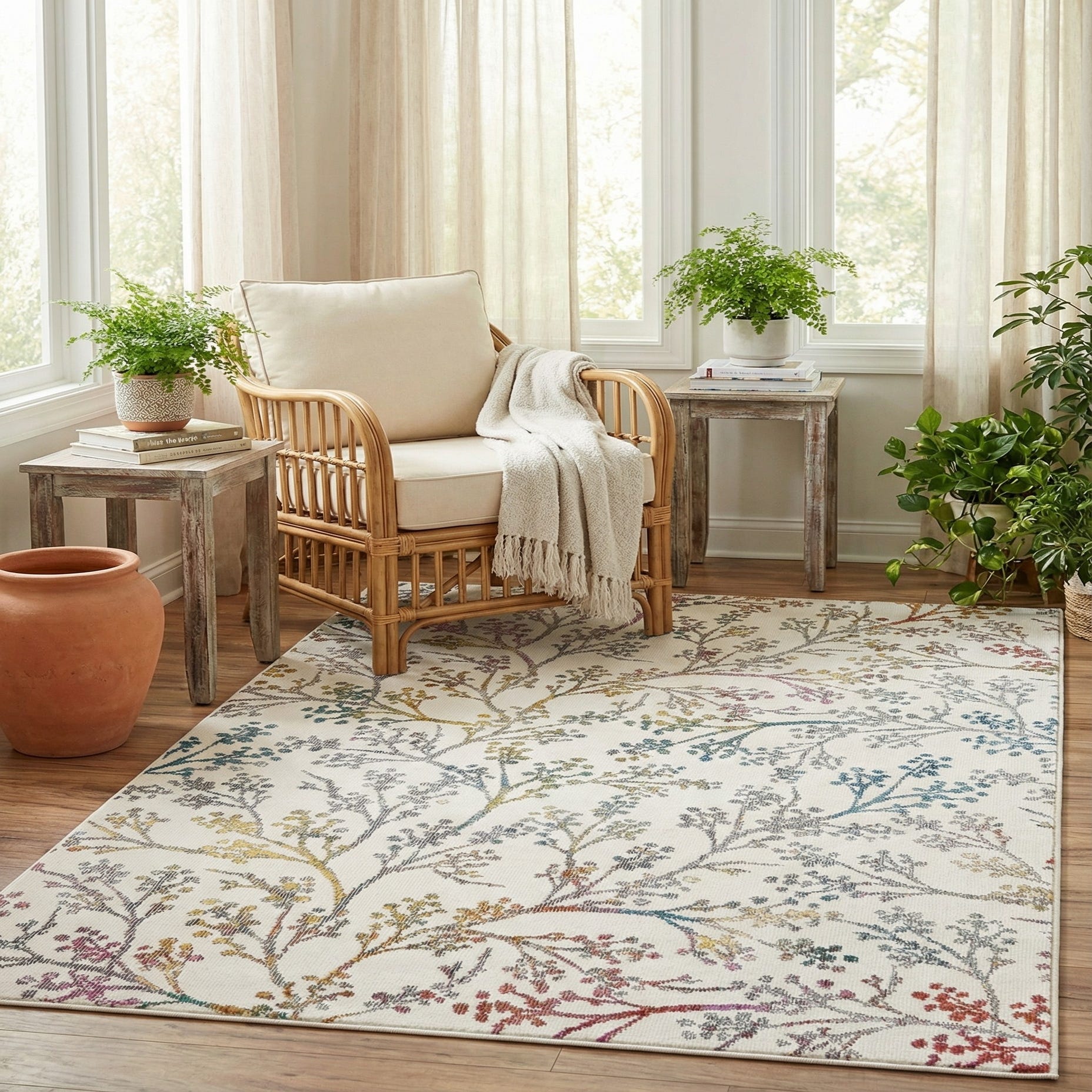 Primary color is Ivory. Colors in this rug include: Ivory, Blue, Gray, Green, Yellow, Pink.