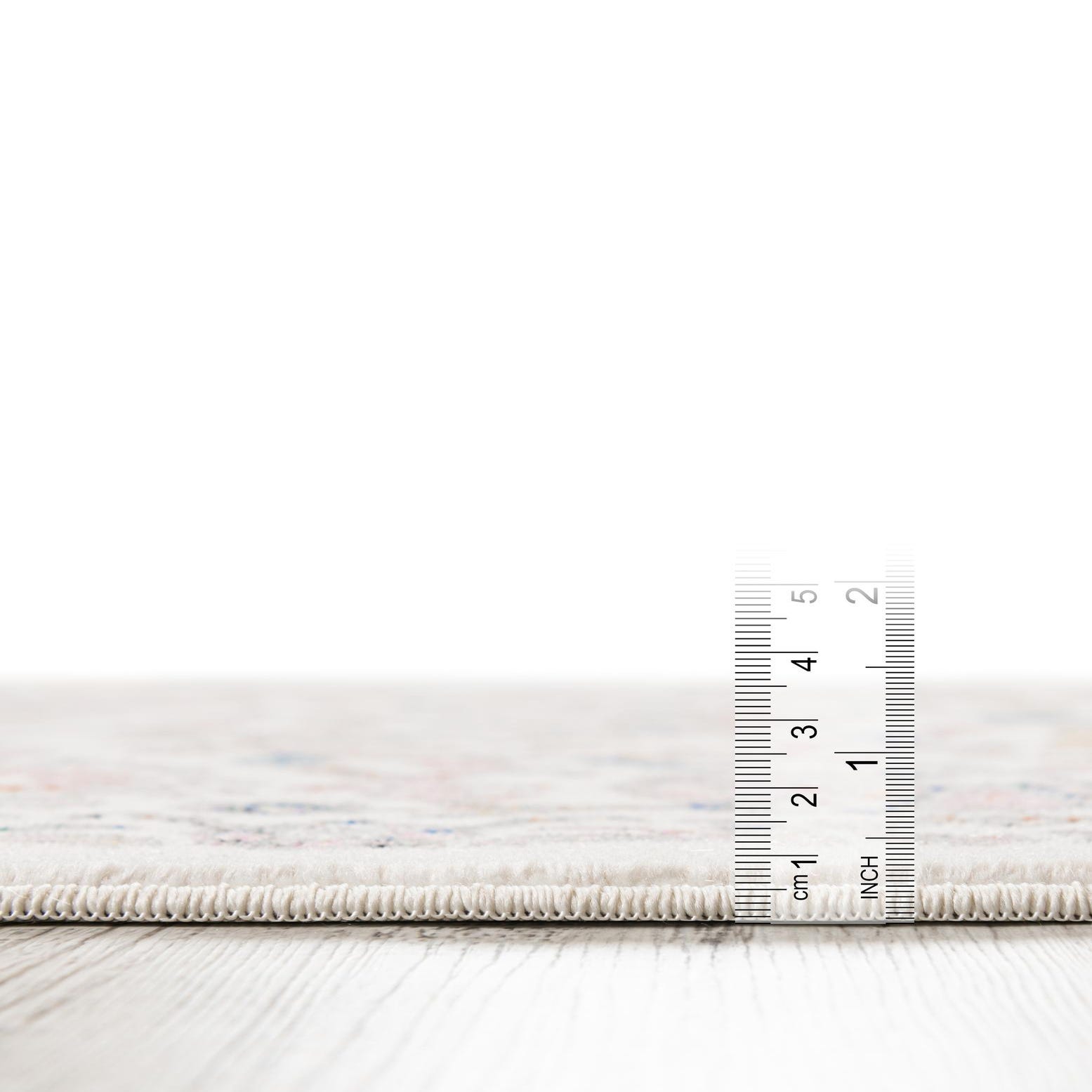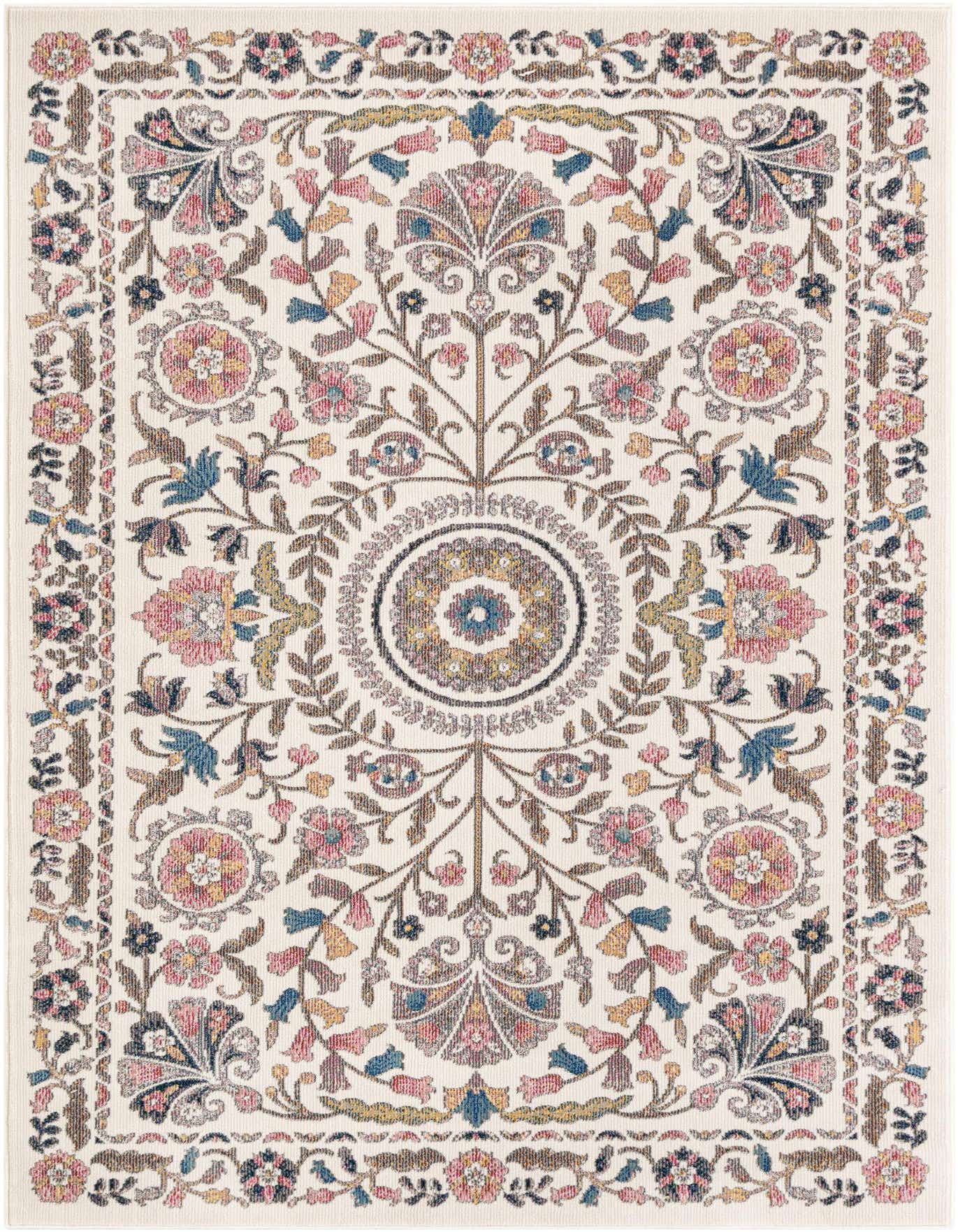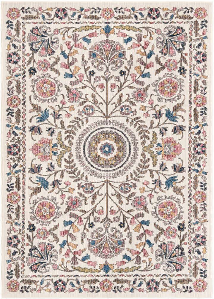 Primary color is Ivory. Colors in this rug include: Ivory, Yellow, Pink, Blue, Gray, Green, Navy Blue.
