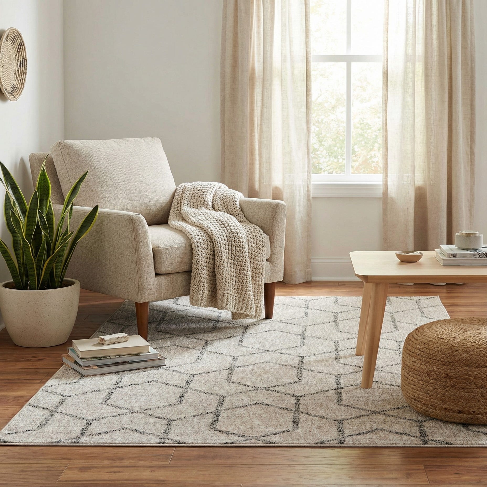 Primary color is Ivory. Colors in this rug include: Ivory, Black, Gray.