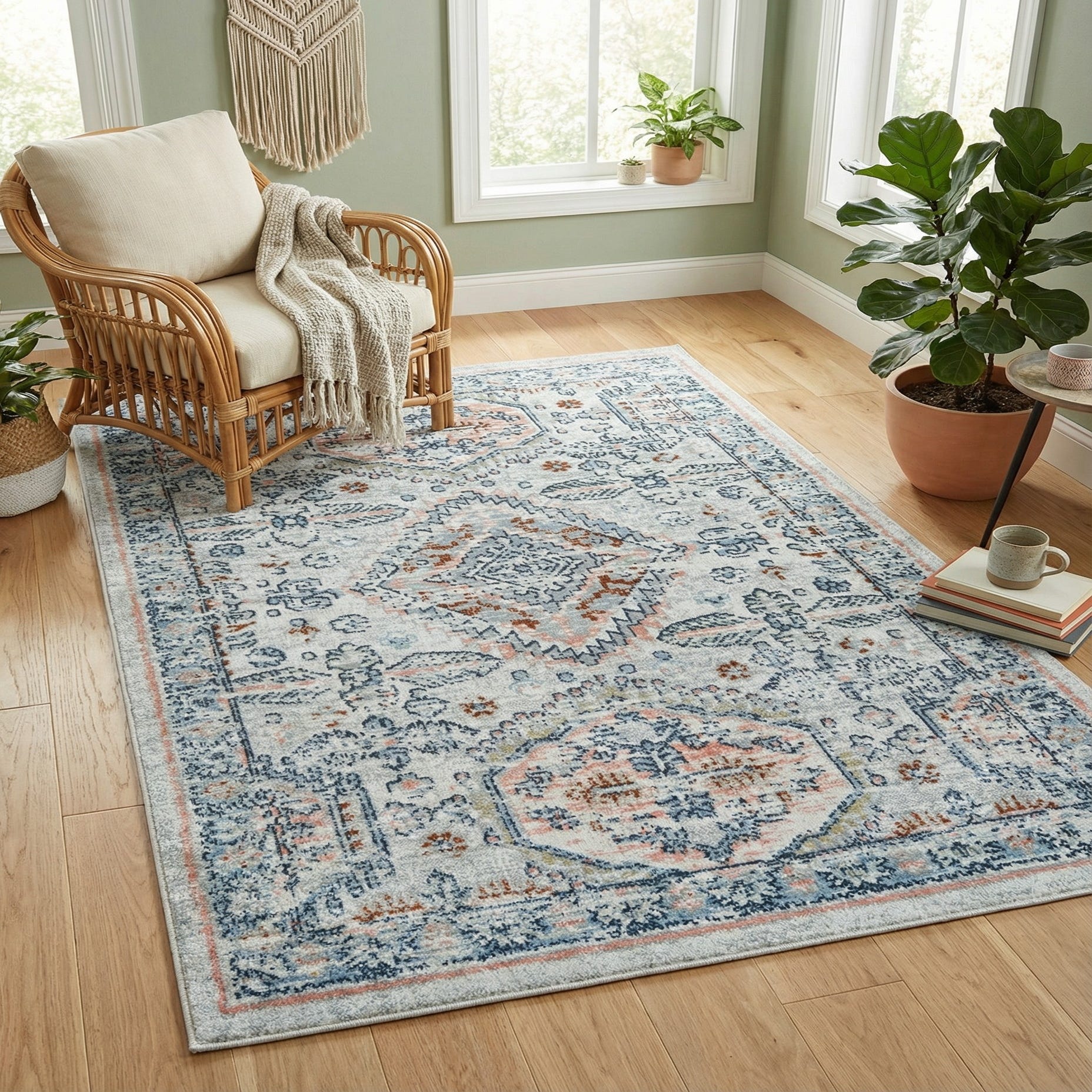 Primary color is Ivory. Colors in this rug include: Ivory, Gray, Navy Blue, Pink, Rust Red, Light Blue.