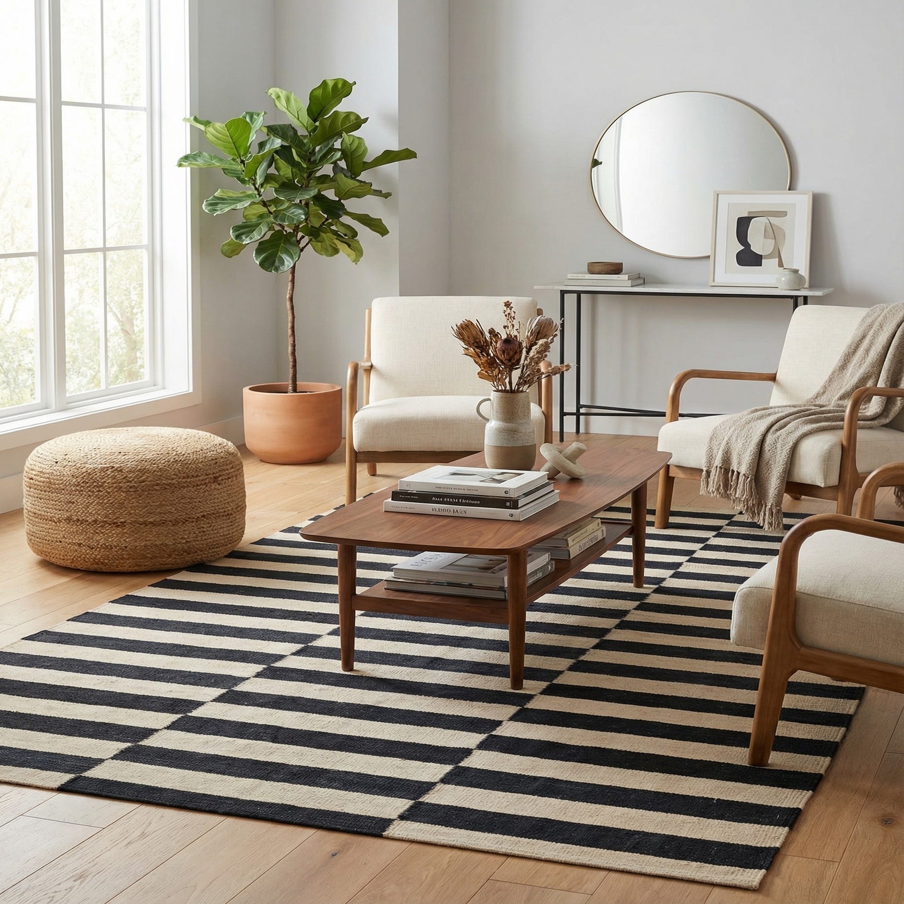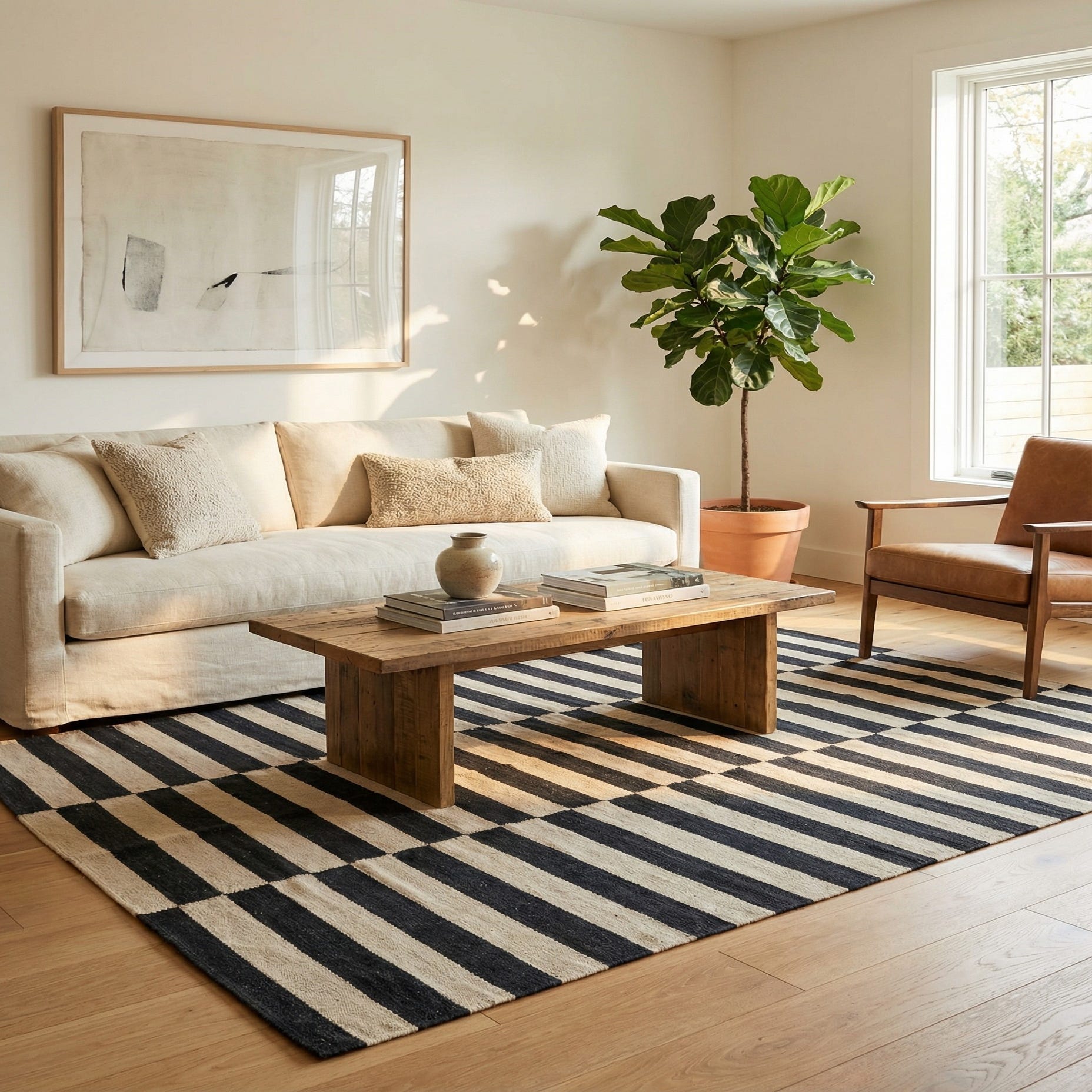 Primary color is Ivory. Colors in this rug include: Ivory, Black.