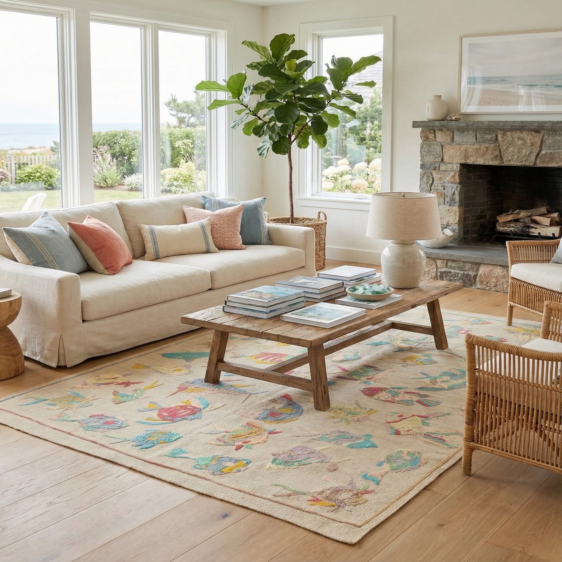 Primary color is Ivory. Colors in this rug include: Ivory, Gray, Red, Yellow, Light Brown, Light Green, Navy Blue.