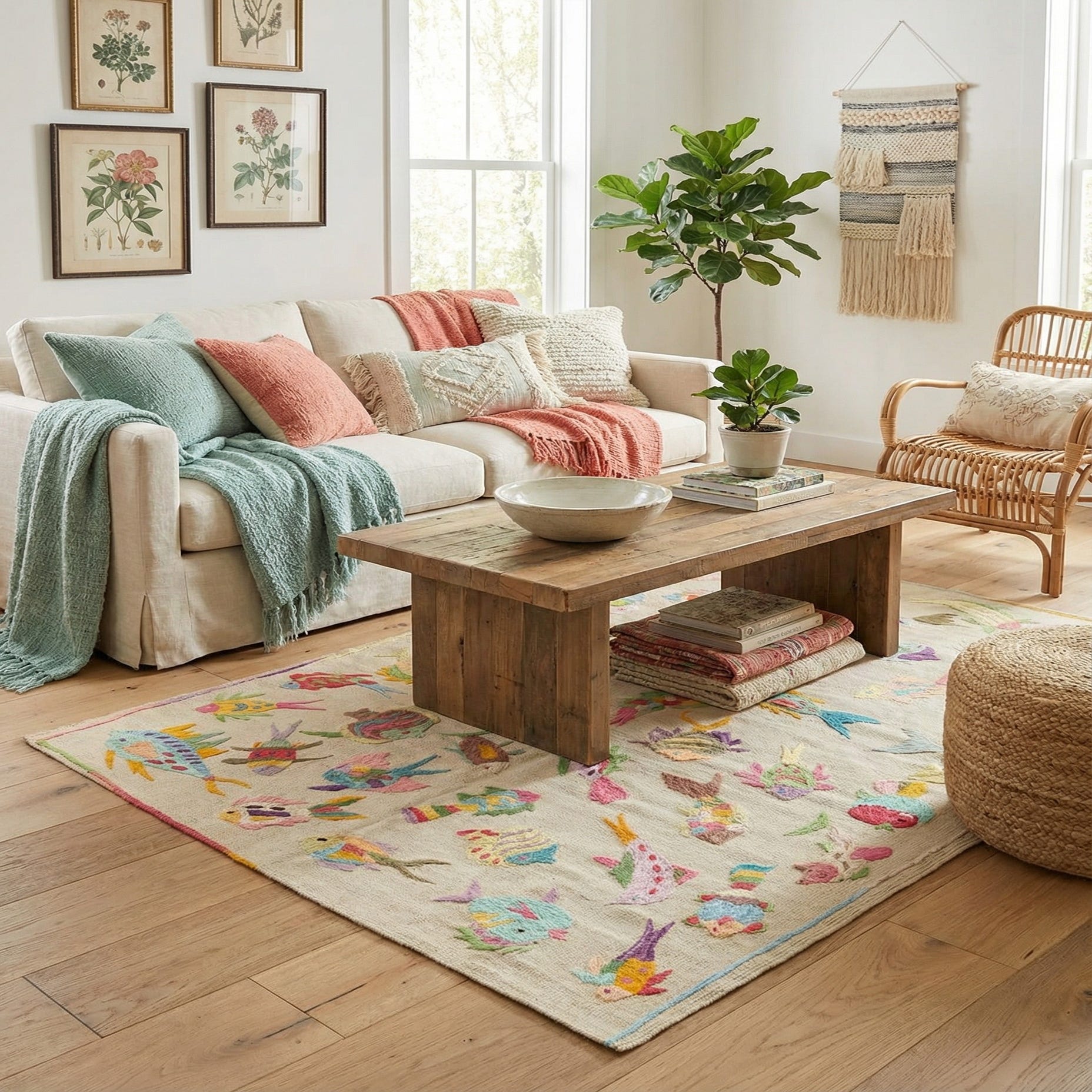 Primary color is Ivory. Colors in this rug include: Ivory, Blue, Gold, Green, Red, Violet, Light Green, Light Blue.