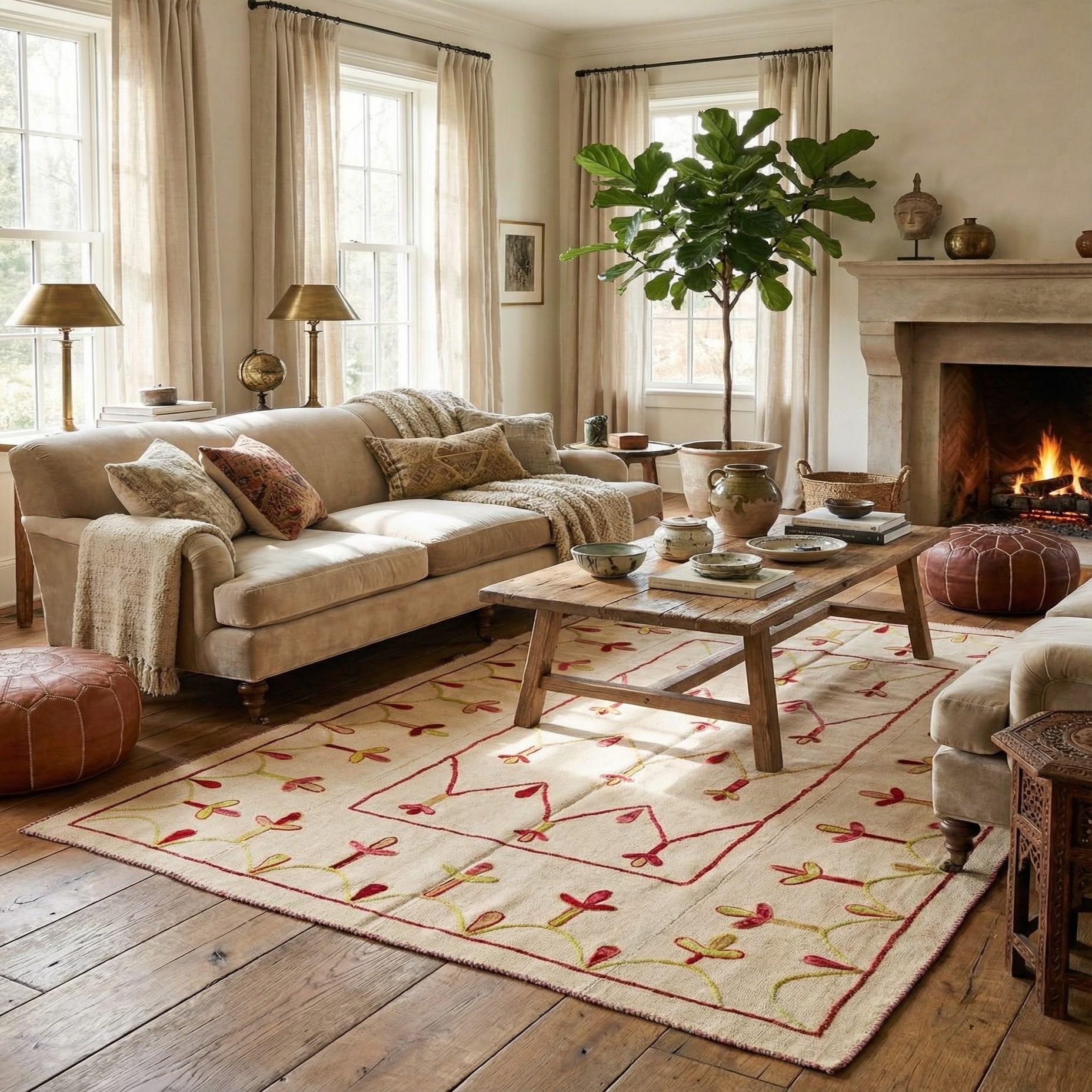 Primary color is Ivory. Colors in this rug include: Ivory, Green, Red, Light Brown.
