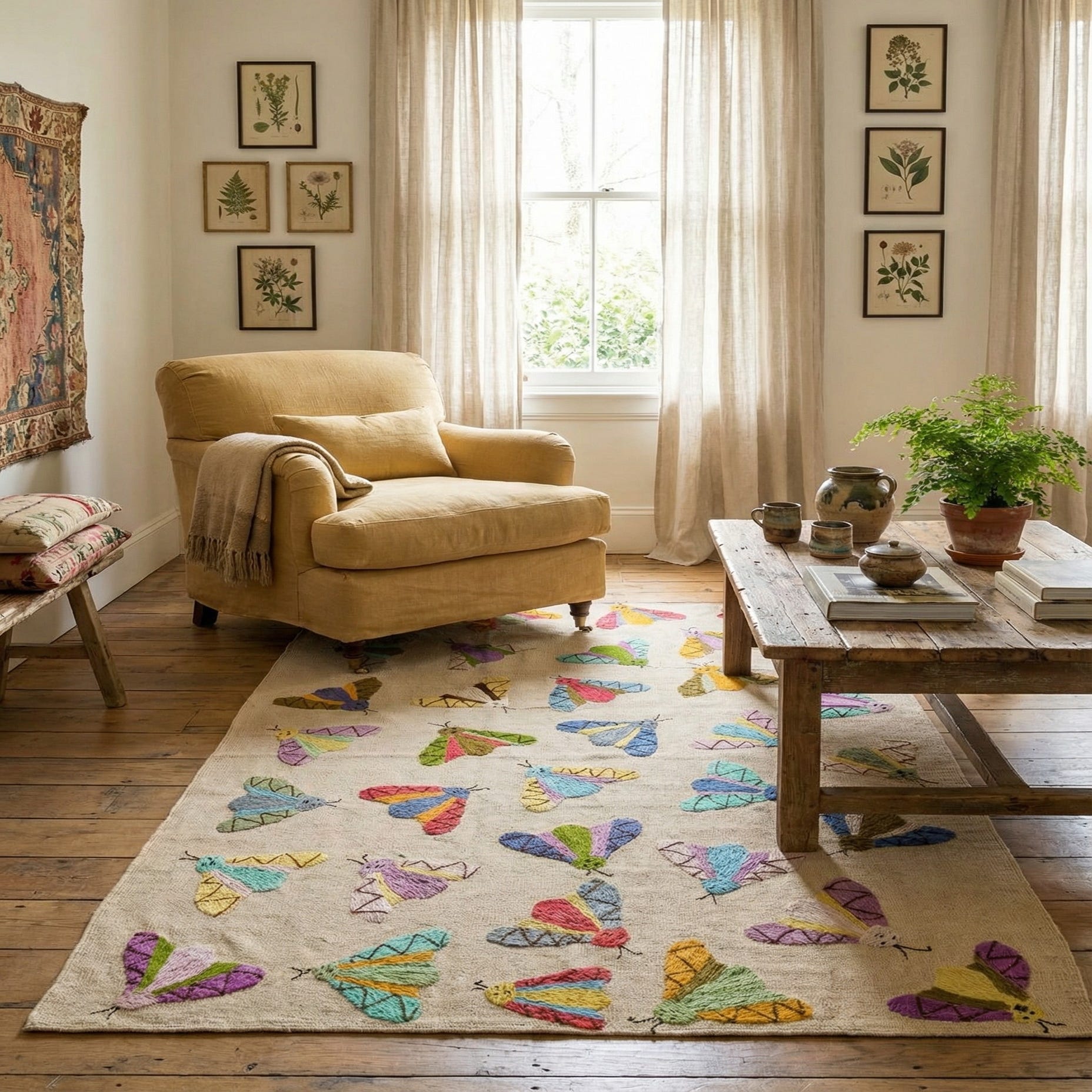 Primary color is Ivory. Colors in this rug include: Ivory, Black, Light Green, Olive, Red, Yellow, Violet, Navy Blue.