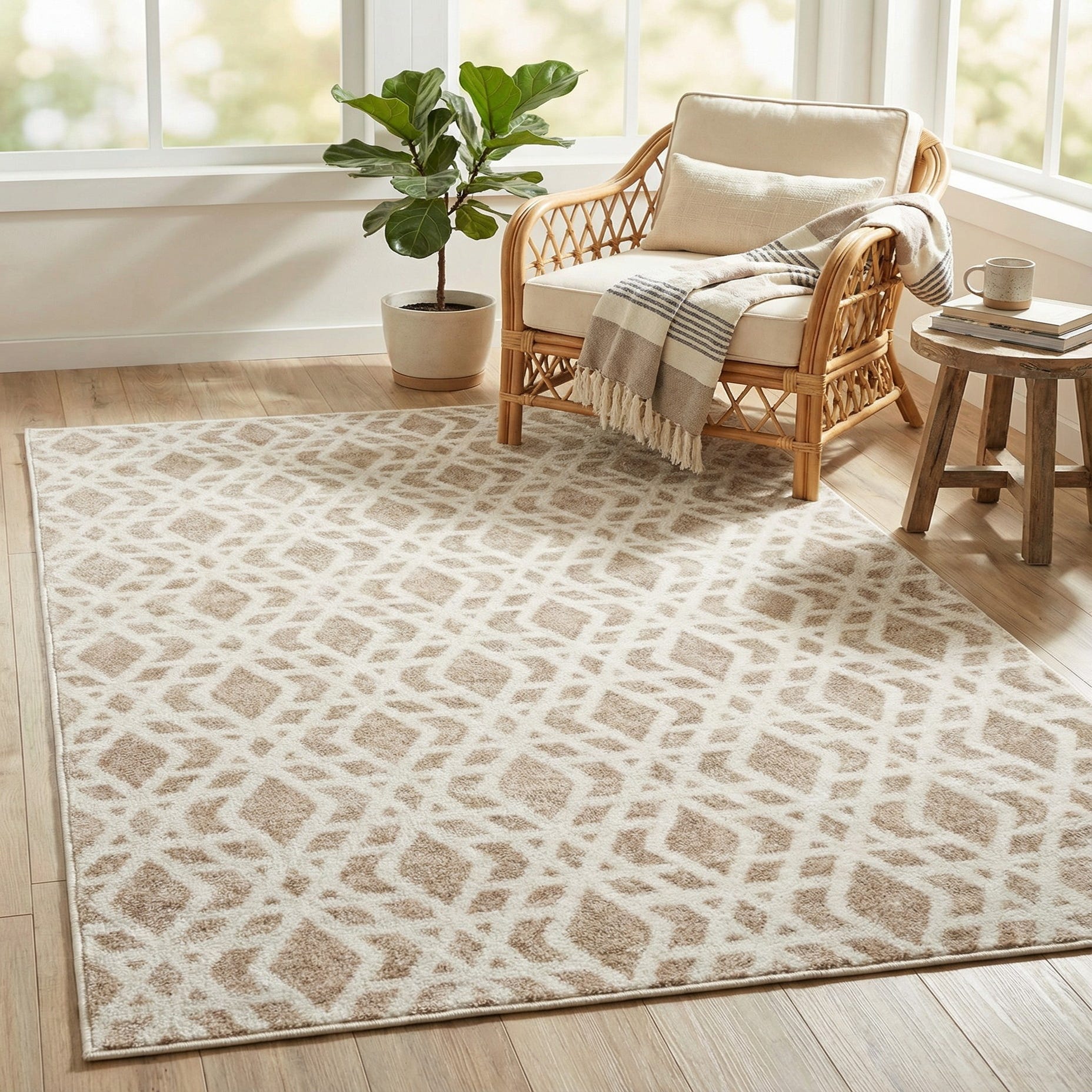Primary color is Ivory. Colors in this rug include: Ivory, Beige, Light Brown.