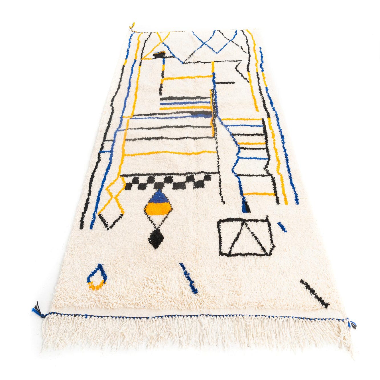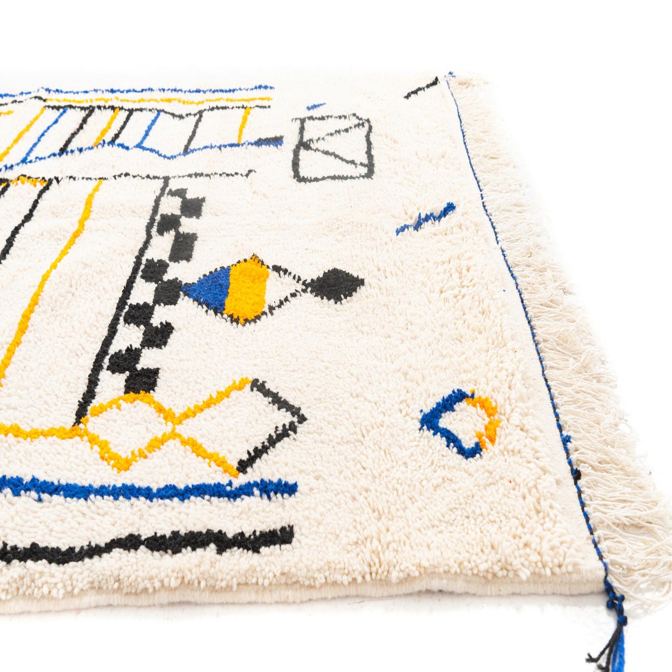 Primary color is Ivory. Colors in this rug include: Ivory, Blue, Black, Yellow.